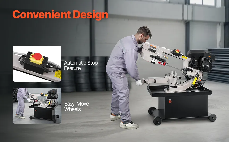 La troncatrice a nastro orizzontale si spegne automaticamente dopo il taglio, evitando tocchi accidentali. Dotata di ruote, si sposta facilmente in vari spazi di lavoro, ideale per fabbriche, negozi di ferramenta e officine di riparazione.