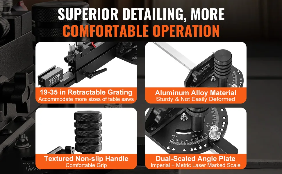 Il calibro di precisione VEVOR è caratterizzato da un design intuitivo. È facile da installare e montare, anche per i principianti. Le istruzioni chiare semplificano il processo, consentendoti di averlo pronto all'uso in pochissimo tempo. La sua semplicità ti consente di concentrarti sui tuoi compiti di lavorazione del legno senza problemi. I suoi comandi semplici consentono regolazioni rapide e un funzionamento senza sforzo, rendendolo uno strumento ideale sia per gli hobbisti che per i professionisti. Il design intuitivo ti consente di ottenere il massimo dal tuo calibro di precisione.