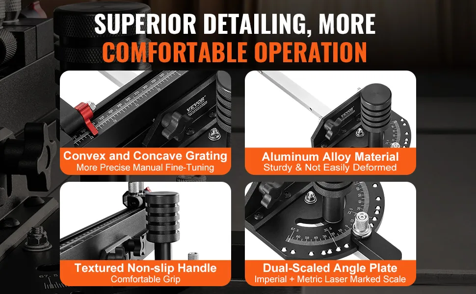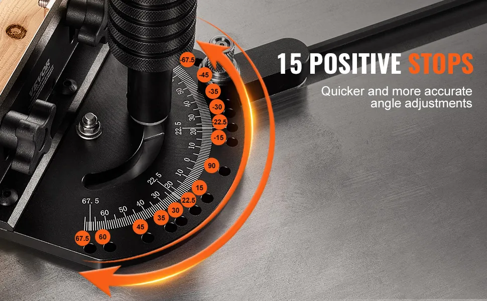 Taglio angolare di precisione: progettata con 15 fori di arresto positivi per massima precisione. Un foro di arresto è impostato a 90 gradi, con sette fori aggiuntivi su ciascun lato a 15°, 22,5°, 30°, 35°, 45°, 60° e 67,5° per coprire la maggior parte degli angoli di lavorazione del legno. Per tagli angolari più complessi, il calibro si regola proporzionalmente, consentendoti di ottenere angoli precisi in modo efficiente e senza sforzo.