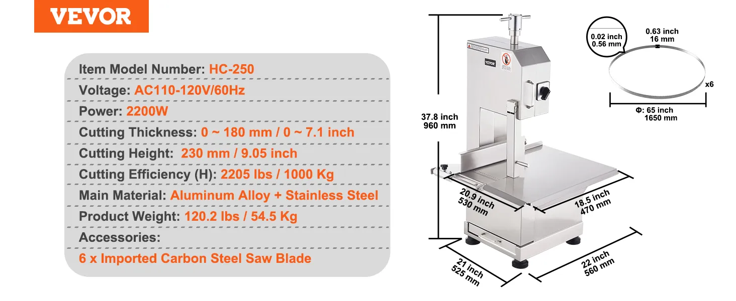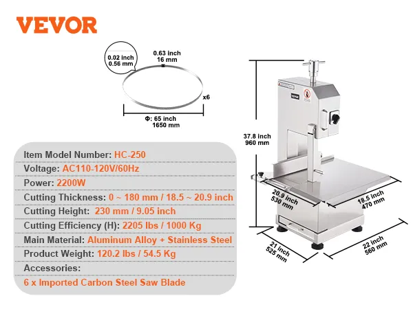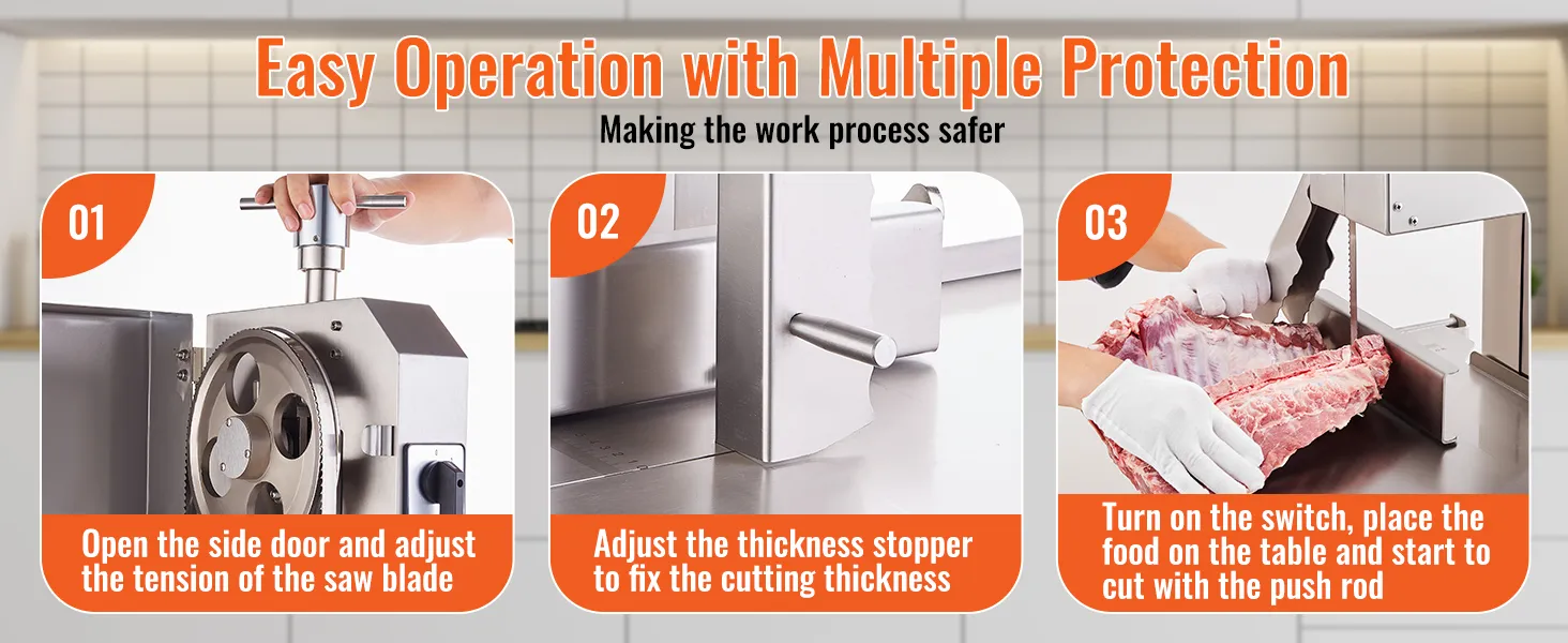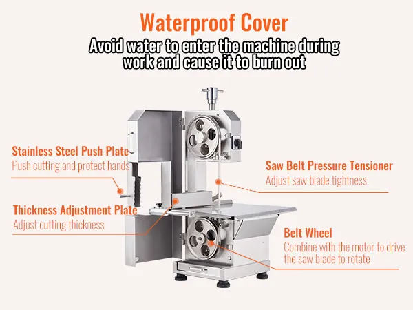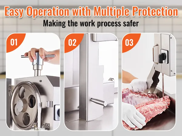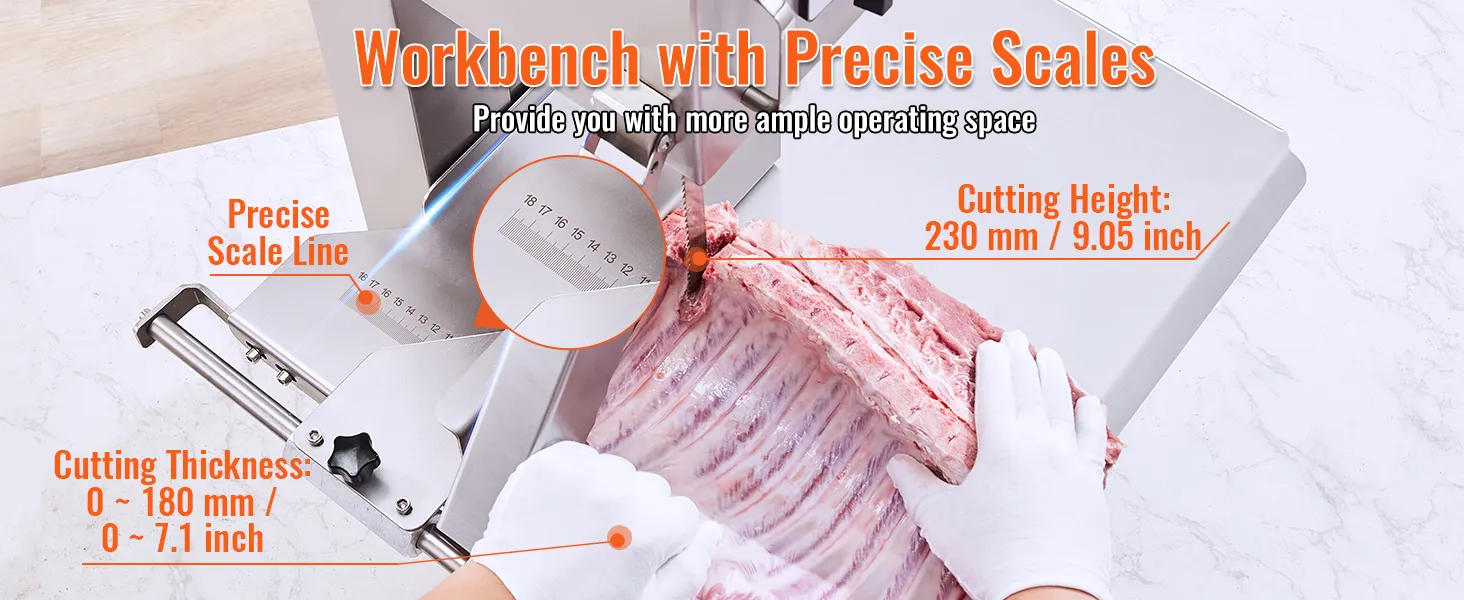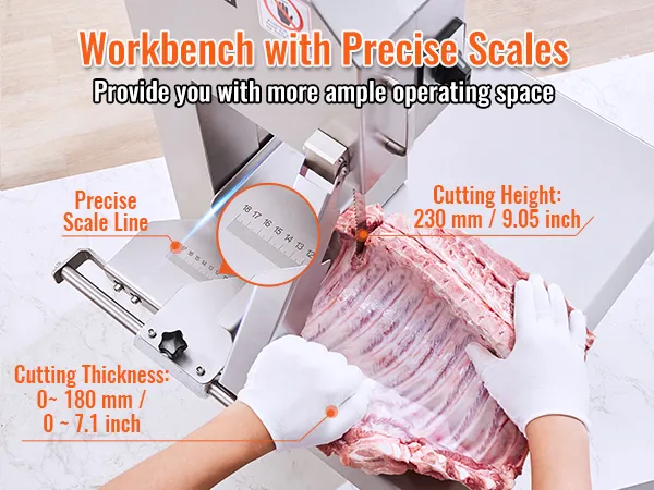 Preciso & Uniforme: il piano di lavoro in acciaio inossidabile fornisce una superficie di taglio con linee di scala precise. È possibile regolare lo spessore desiderato in modo più accurato secondo la necessità. La macchina per il taglio di ossa commerciale può gestire grandi pezzi di ossa di agnello e ossa di manzo. Lo spessore di taglio può essere regolato da 0 a 180mm, consentendo ottimi risultati con fette di prosciutto sottili o grossi pezzi di osso.