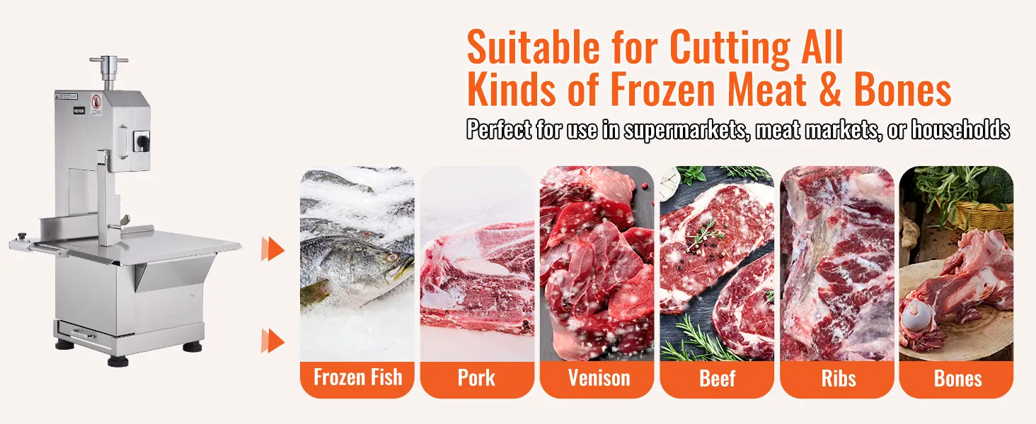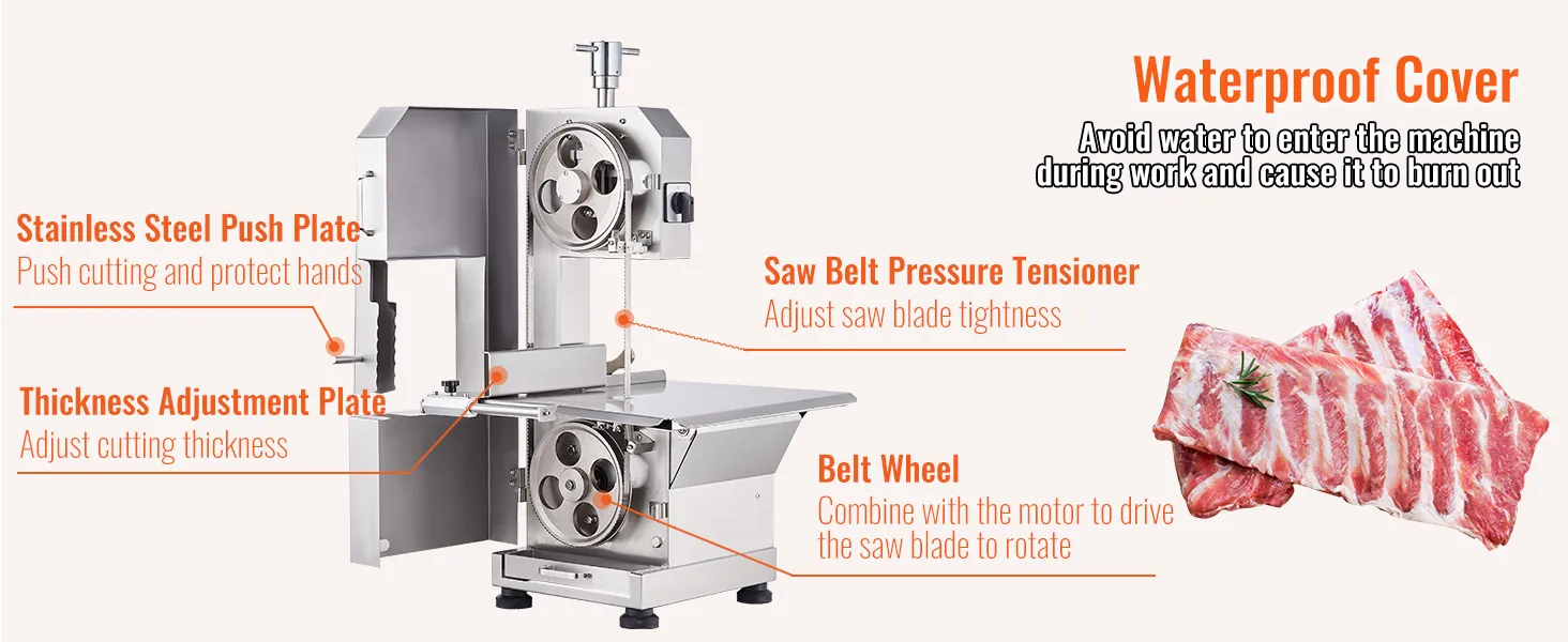 La macchina elettrica segaossa da banco è perfetta per tagliare costine, carne di cervo, ossa di manzo, ossa di agnello e persino pesce congelato. È un assistente pratico per ristorante, macellerie, supermercato, ecc.