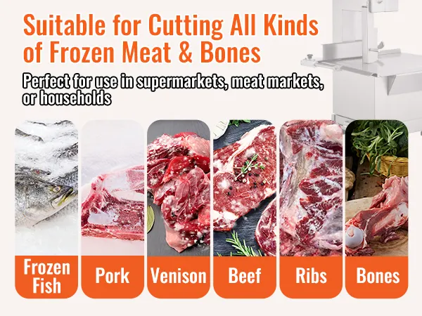 Ampie Applicazioni: la macchina segaossa commerciale a nastro elettrica per carne è ideale per tagliare carne di cervo, ossa di manzo, ossa di agnello, pesce congelato e altro ancora. Adatto per ristorante, macellerie, supermercato, ecc.