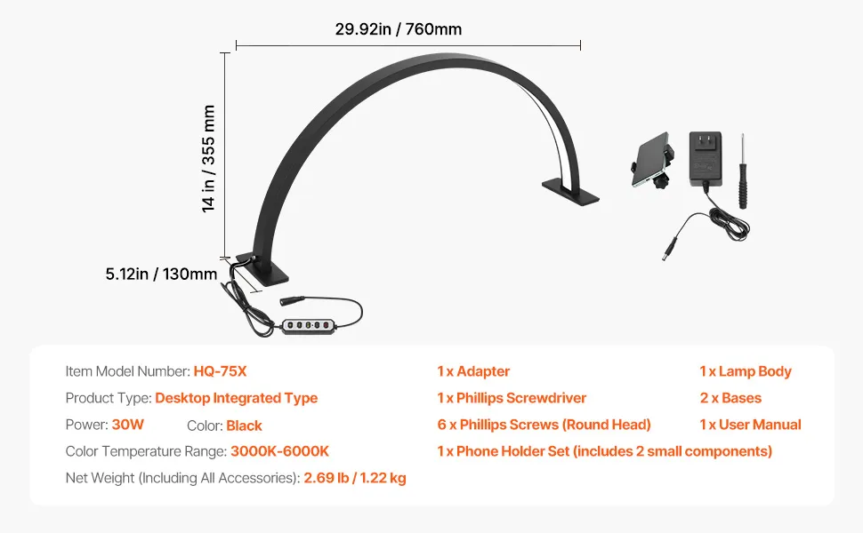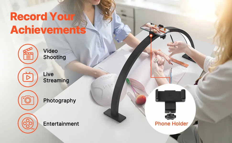 VEVOR Lampada da Tavolo per Unghie a Forma di Mezzaluna da 30 W con Supporto per Telefonino Luminosità Temperatura del Colore Regolabile, Lampada da Tavolo a LED ad Arco per Trucco Salone Bellezza