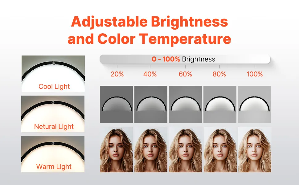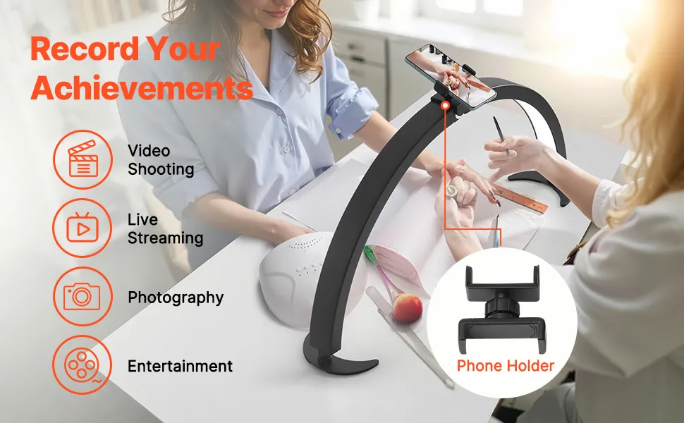 La nostra luce a mezzaluna è dotata di un supporto per telefono. Puoi facilmente appoggiare il tuo cellulare sul supporto per guardare video didattici o riprodurre musica rilassante.