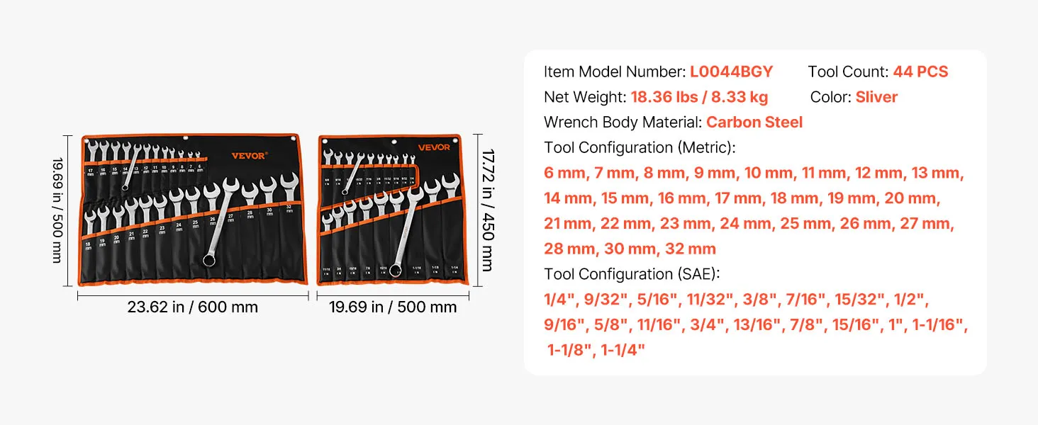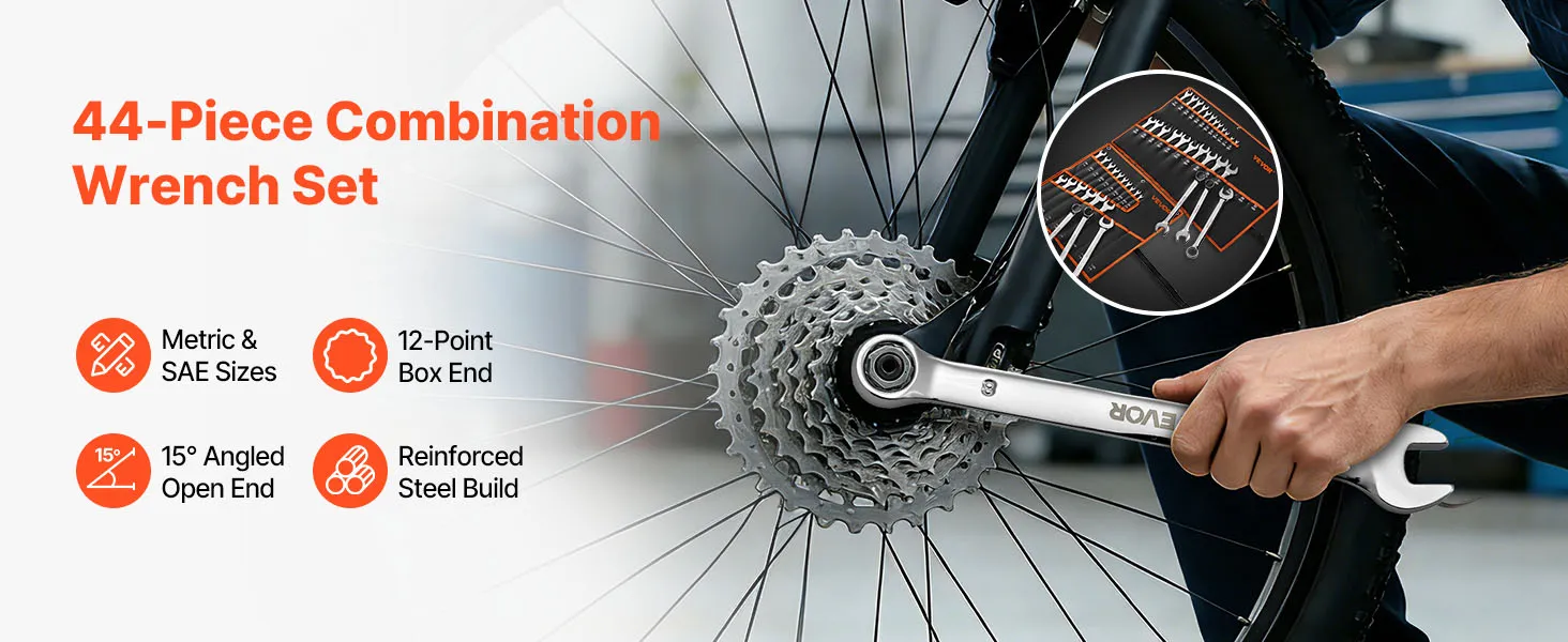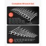 VEVOR Set di Chiavi Combinate a Cricchetto 44 Pezzi, Set di Chiavi a Cricchetto con Misure Metriche e SAE, Profilo a 12 Punti e Bocca Angolata a 15° con Custodia Arrotolabile, Finitura Argento Lucido