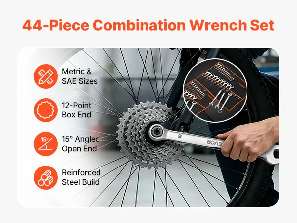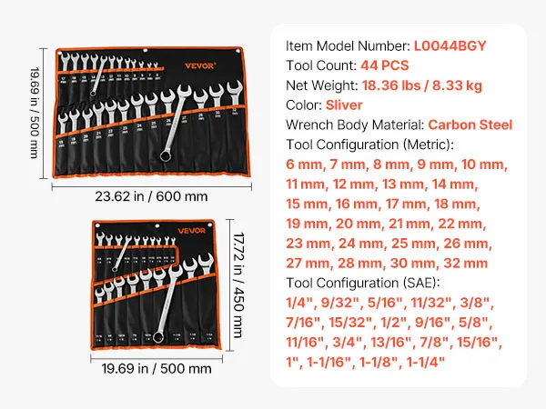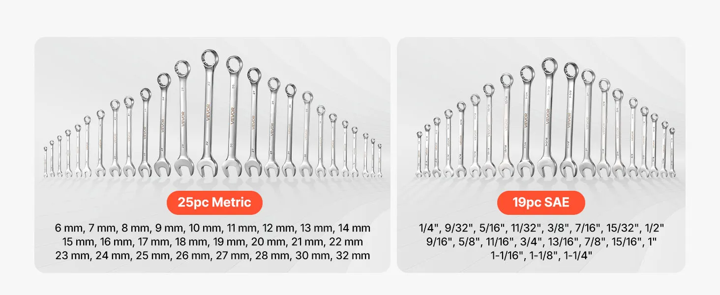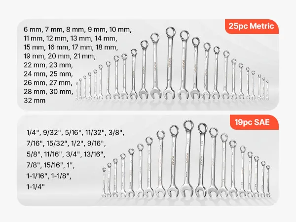 • Ampia copertura di dimensioni: Questao set da 44 chiavi combinate metriche e SAE include misure da 6 a 32 mm e da 1/4 pollici a 1-1/4 pollici, offrendo le dimensioni comuni per riparazioni auto, assemblaggio meccanico, manutenzione di elettrodomestici e progetti fai da te
