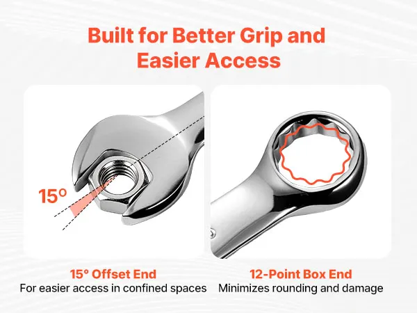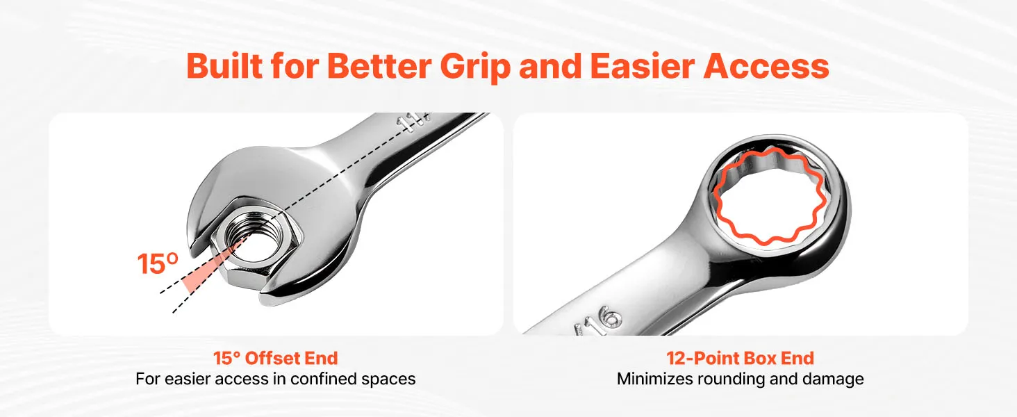 • Estremità aperta inclinata a 15° per un migliore accesso: L'estremità aperta inclinata a 15° offre maggiore spazio per le mani, facilitando la rotazione in spazi ristretti o difficili. Le nostre chiavi combinate creano spazio di rotazione dove le chiavi piatte non possono muoversi liberamente, migliorando comfort ed efficienza