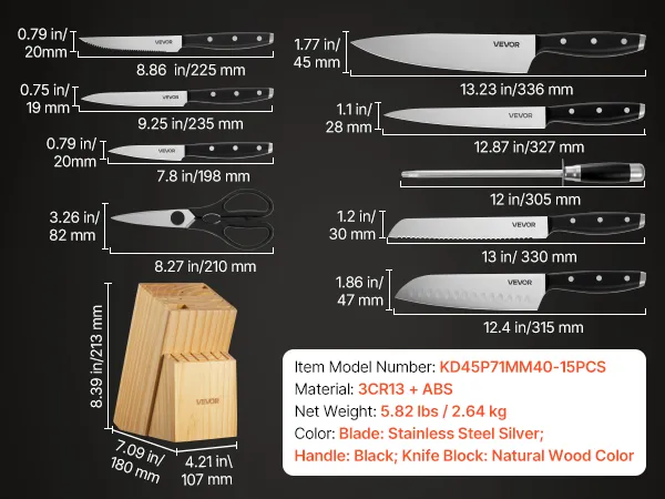 Set di coltelli da 15 pezzi: un coltello da 203 mm, un coltello da 203 mm, un coltello da 203 mm, un coltello 177 mm, un coltello da 127 mm, sei coltelli da 114 mm, un coltello da 88 mm, un acciaino da 203 mm, forbici da cucina e un ceppo di legno