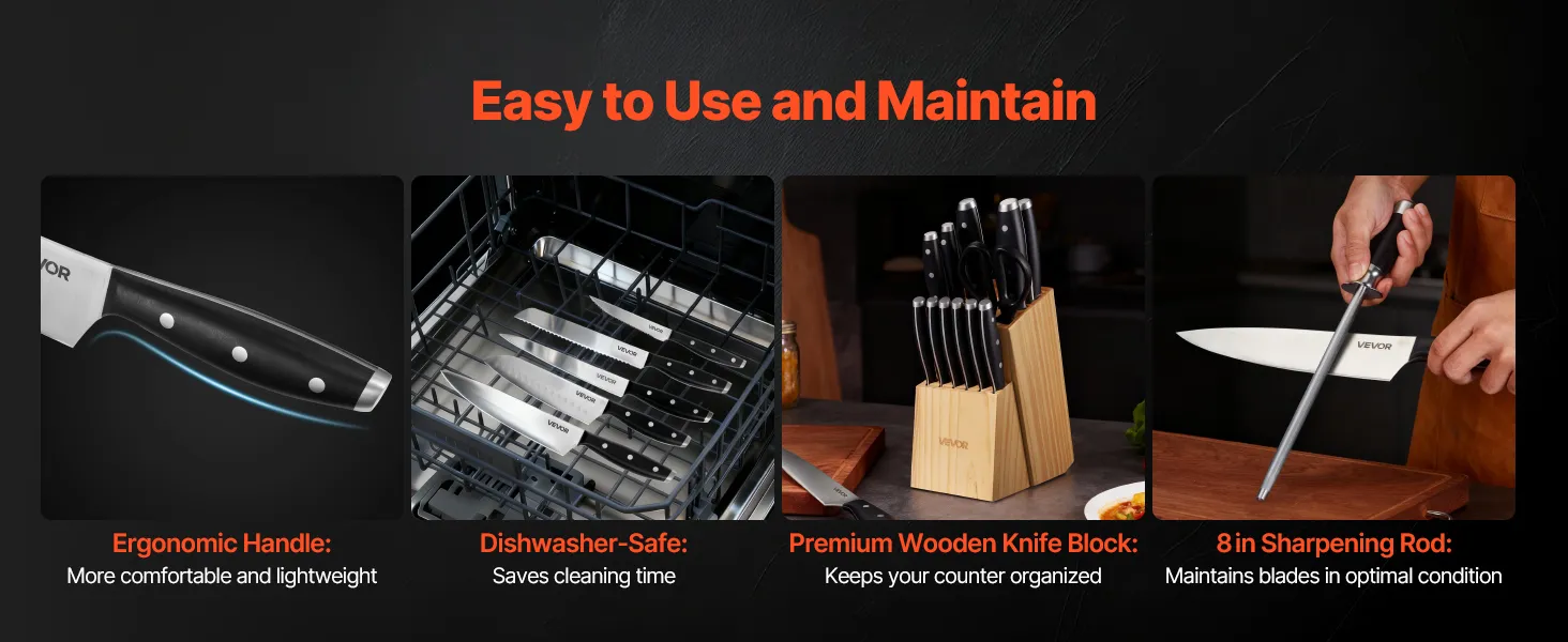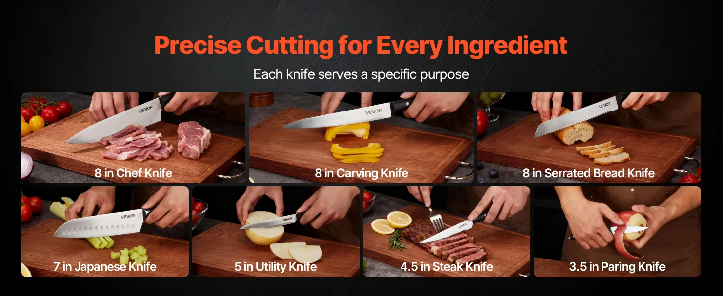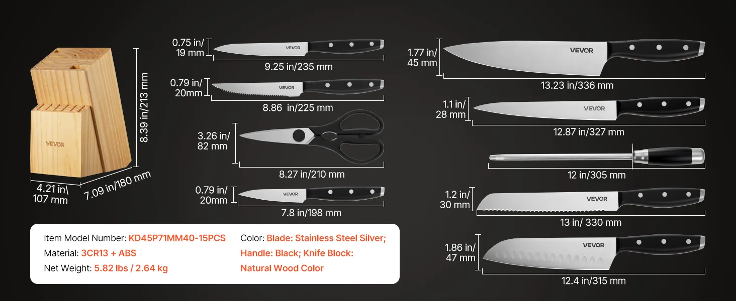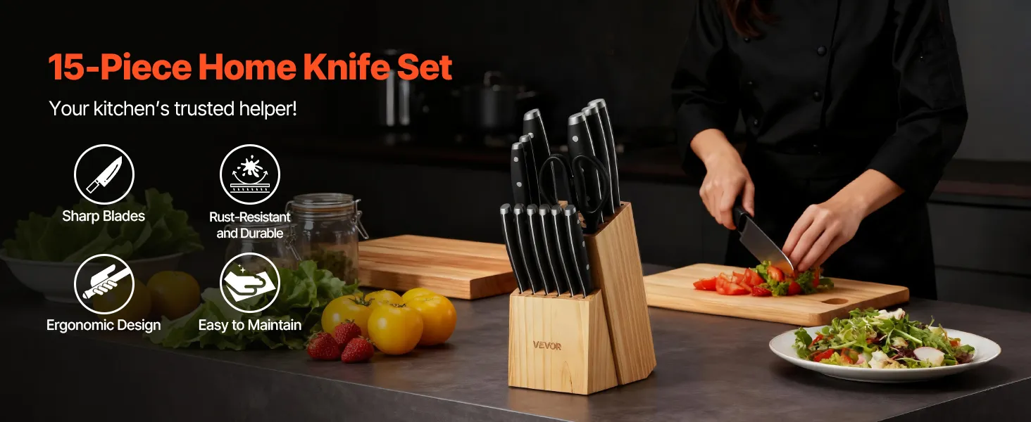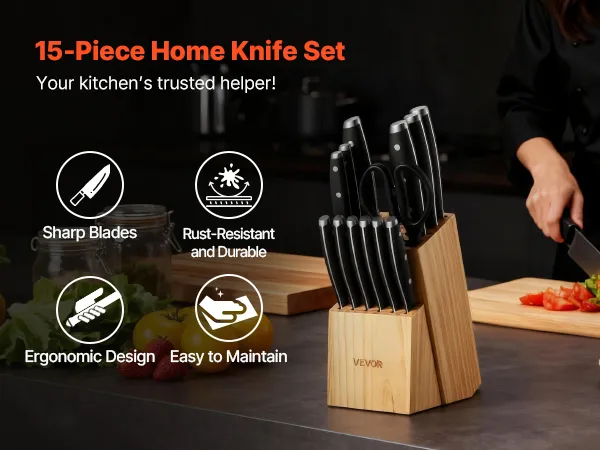 VEVOR Set di Coltelli da Cucina con Ceppo Portacoltelli Legno di Pino e Acciaino da 15 Pezzi in Acciaio Inossidabile ad Alto Tenore di Carbonio, Coltello da Cucina con Impugnatura Ergonomica in ABS