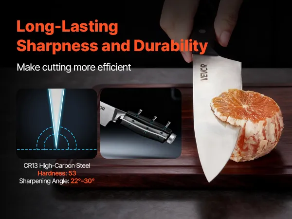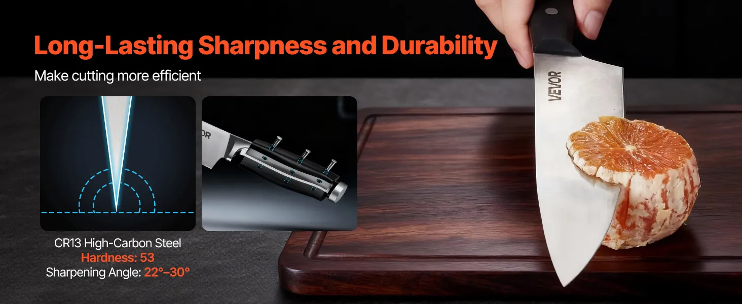 Durevole e antiruggine: set di coltelli, realizzato in acciaio inossidabile 3CR13 ad alto tenore di carbonio, è caratterizzato da elevata durezza. Il trattamento di oliatura sottovuoto seguito da passivazione rende le lame resistenti alla ruggine