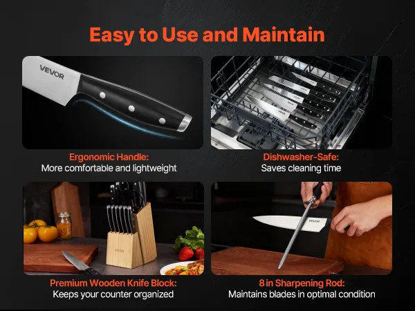 Facile da riporre e da pulire: gli scomparti divisi del ceppo portacoltelli consentono un facile accesso e un'organizzazione chiara. Tutte le lame sono lavabili in lavastoviglie per una facile pulizia