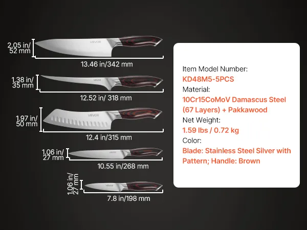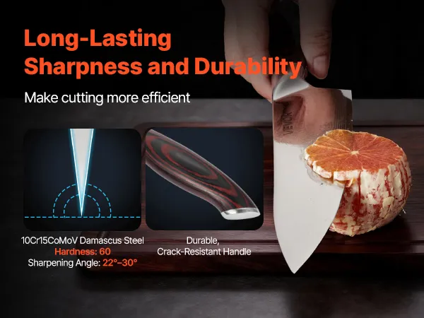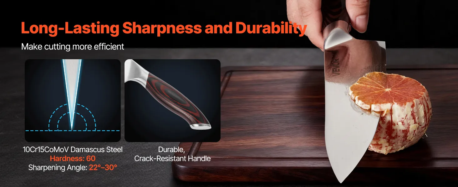 Durevole e antiruggine: questo set di coltelli, realizzato in acciaio Damasco 10Cr15CoMoV, offre durezza e tenacità eccezionali. Le lame sono sottoposte a un trattamento termico sottovuoto con olio e passivazione
