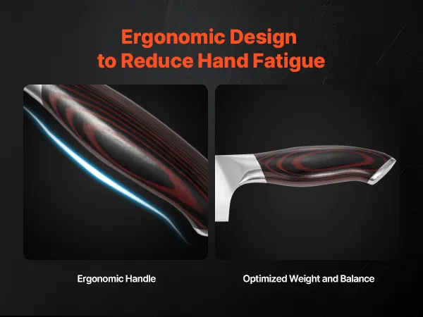 Questo set di coltelli, realizzato in acciaio al carbonio di alta qualità, offre l'equilibrio ideale tra durezza e tenacità, mantenendo l'affilatura in modo permanente senza dover essere riaffilato frequentemente. Il manico è resistente alla rottura e saldamente fissato.