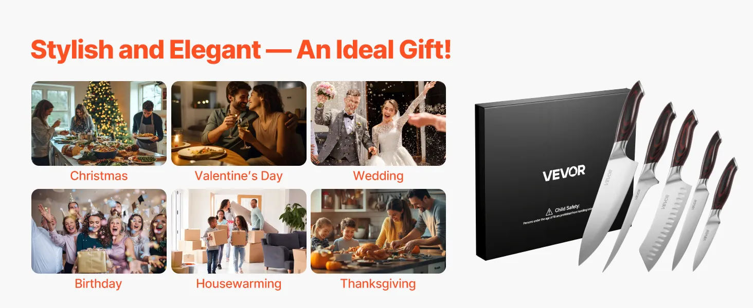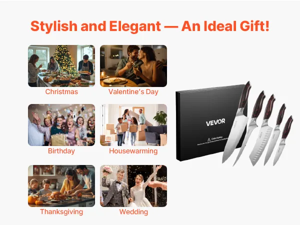 Questo set di coltelli in acciaio inossidabile unisce eleganza e funzionalità, aggiungendo un tocco moderno e sofisticato alla tua cucina. È il regalo ideale per San Valentino, Natale, matrimoni e compleanni: una sorpresa indimenticabile per tutti gli appassionati di cucina.