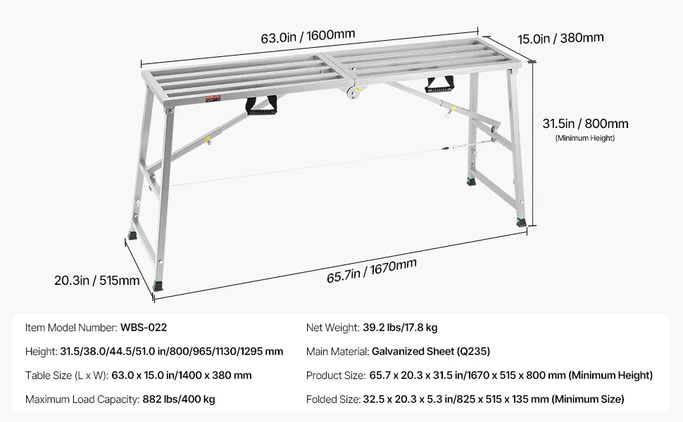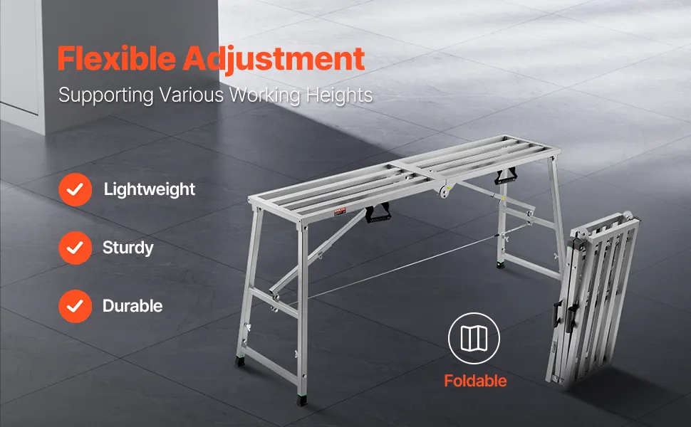 Compatto e facile da riporre: la piattaforma di lavoro VEVOR è progettata pensando alla praticità. Una volta piegata, si riduce a una dimensione compatta di 32,48 x 20,28 x 5,31 pollici e pesa solo 39,2 libbre/17,8 kg. Il suo design leggero la rende facile da trasportare, riporre e risparmiare spazio.