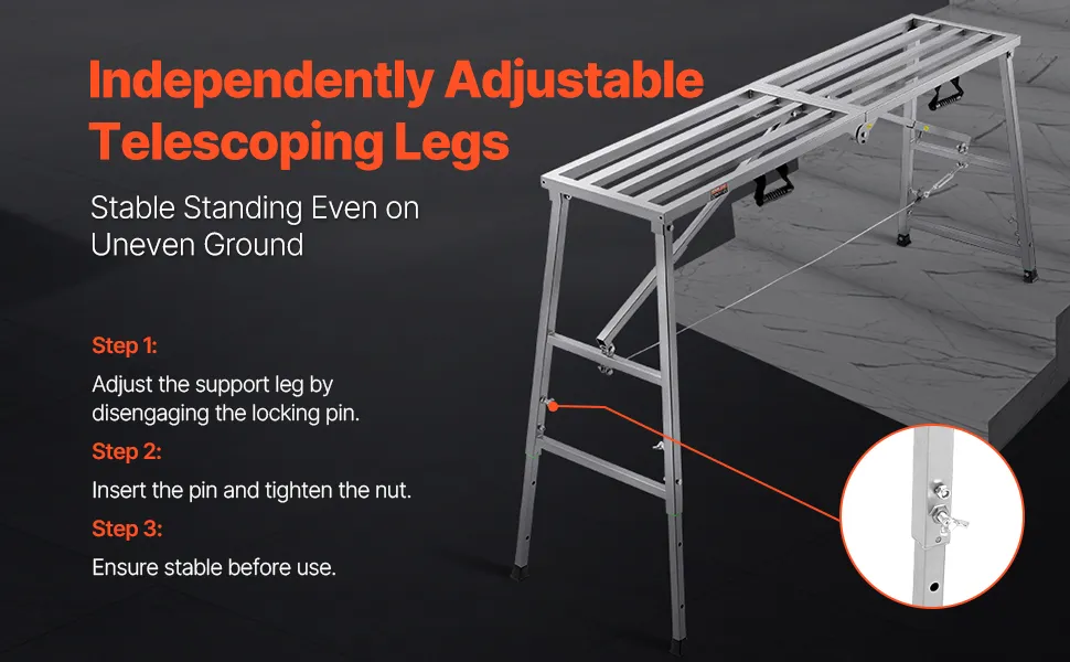 Altezza regolabile per versatilità: la piattaforma per impalcature offre una gamma di regolazioni dell'altezza, con quattro impostazioni: 31,5 pollici, 37,99 pollici, 44,49 e 51 pollici. Questa adattabilità ti consente di affrontare un'ampia gamma di attività.