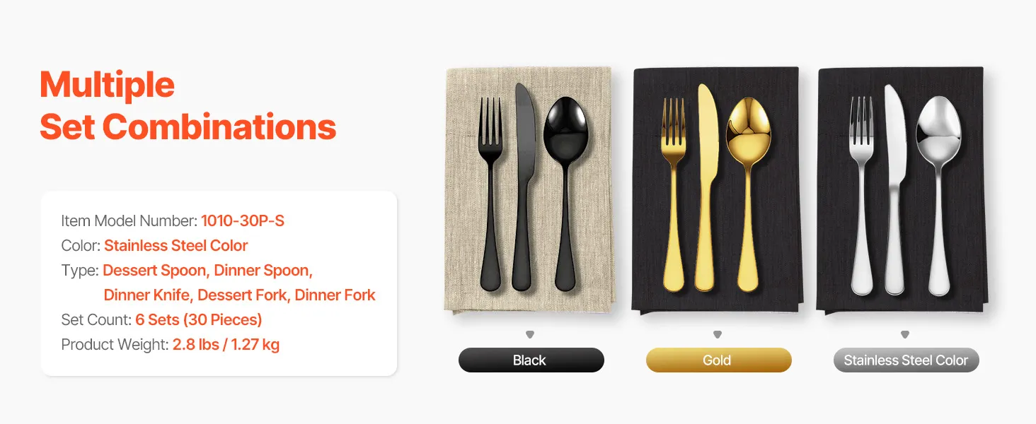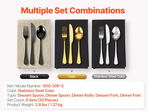 Set di posate da 30 pezzi: questo set di posate comprende 6 forchette da tavola, 6 cucchiai da tavola, 6 coltelli da tavola, 6 forchette da dessert e 6 cucchiai da dessert, rendendolo un articolo essenziale per la casa e il ristorante. Che si tratti dei pasti di tutti i giorni, della preparazione della cena o delle feste, questo set di posate è uno strumento da pranzo essenziale