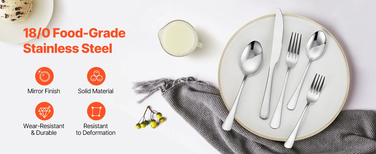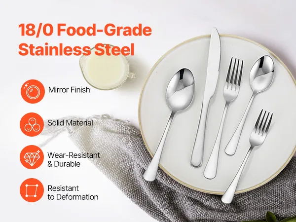 Realizzato in acciaio inossidabile 18/0, questo set di posate è durevole, resistente alla corrosione, alla ruggine e ben bilanciato. Il design con bordo liscio garantisce comfort durante l'utilizzo. Lavabile in lavastoviglie, con peso e spessore perfetti per una facile movimentazione.