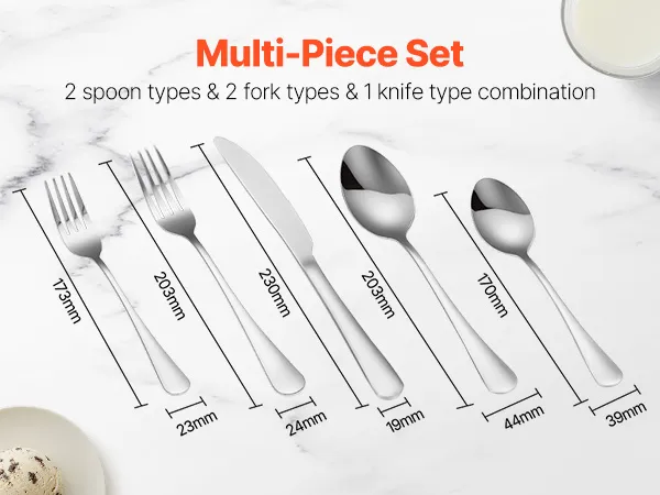 Questo set offre una combinazione di 2 tipi di cucchiai, 2 tipi di forchette e 1 tipo di coltello, inclusi cucchiai da dessert, cucchiai da tavola, coltelli da tavola, forchette da dessert e forchette da tavola per soddisfare le tue esigenze culinarie quotidiane.