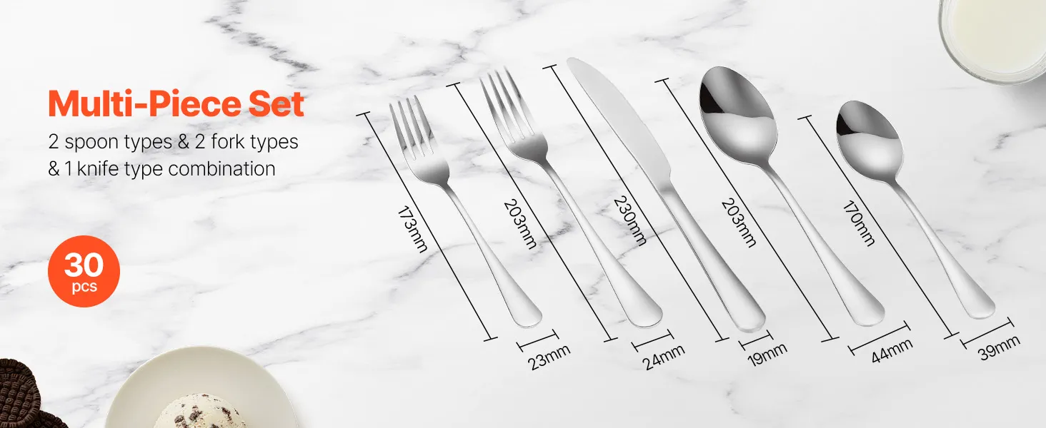 VEVOR Set di Posate in Acciaio Inox per Uso Alimentare, Set di Posate Altamente Lucide, Stoviglie in Lavastoviglie, Servizio 6 Persone, Include Coltello Forchetta Cucchiaio 30 Pezzi 1,27 kg