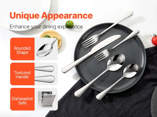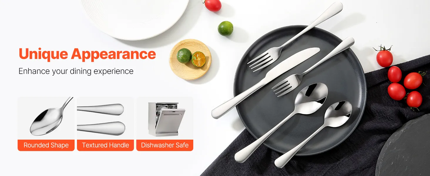 Acciaio inossidabile di alta qualità: realizzato in acciaio inossidabile 18/0 di alta qualità, questo set di posate è durevole, resistente alla corrosione e alla ruggine e ha un eccellente equilibrio. Il design con bordi lisci garantisce comfort durante l'uso. È lavabile in lavastoviglie, perfettamente ponderato e progettato per durare a lungo