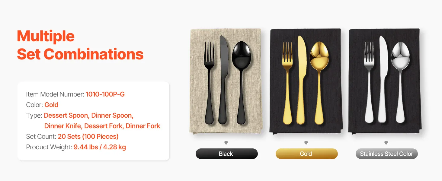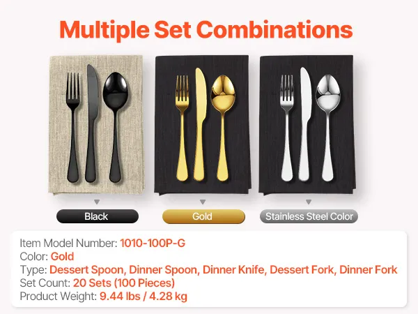 Set di posate da 100 pezzi: questo set di posate comprende 20 forchette da tavola, 20 cucchiai da tavola, 20 coltelli da tavola, 20 forchette da dessert e 20 cucchiai da dessert, rendendolo un articolo essenziale per la casa e il ristorante. Che si tratti dei pasti di tutti i giorni, della preparazione della cena o delle feste, questo set di posate è uno strumento da pranzo essenziale