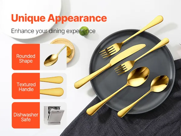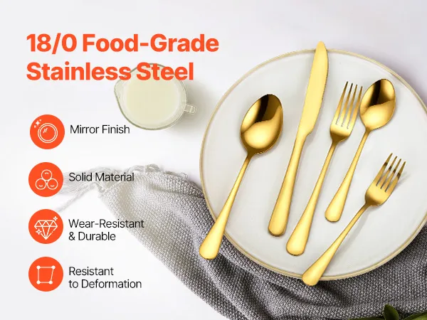 Acciaio inossidabile di alta qualità: realizzato in acciaio inossidabile 18/0 di alta qualità, questo set di posate è durevole, resistente alla corrosione e alla ruggine e ha un eccellente equilibrio. Il design con bordi lisci garantisce comfort durante l'uso. È lavabile in lavastoviglie, perfettamente ponderato e progettato per durare a lungo