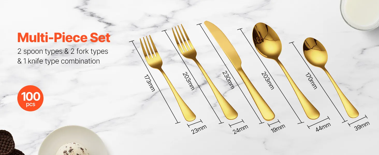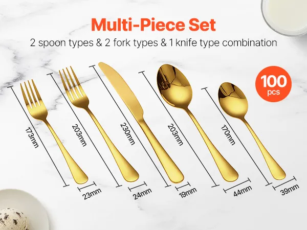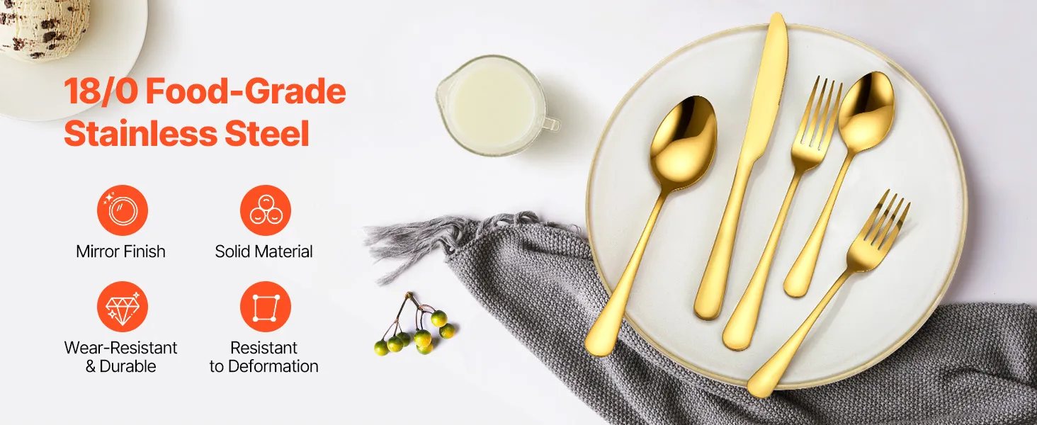 VEVOR Set di Posate in Acciaio Inossidabile per Uso Alimentare, Set Posate Altamente Lucide, Stoviglie in Lavastoviglie, Servizio 20 Persone, Coltello Forchetta Cucchiaio 100 Pezzi in Oro