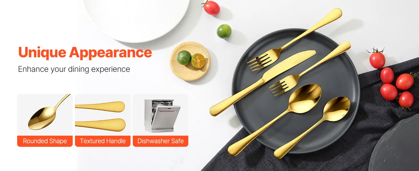 Design moderno ed elegante: i set di posate riutilizzabili per il ristorante di casa presentano un design elegante e moderno che si abbina facilmente a una varietà di impostazioni della tavola, dai pasti informali di tutti i giorni alle occasioni formali. Il suo stile sofisticato migliora la tua esperienza culinaria