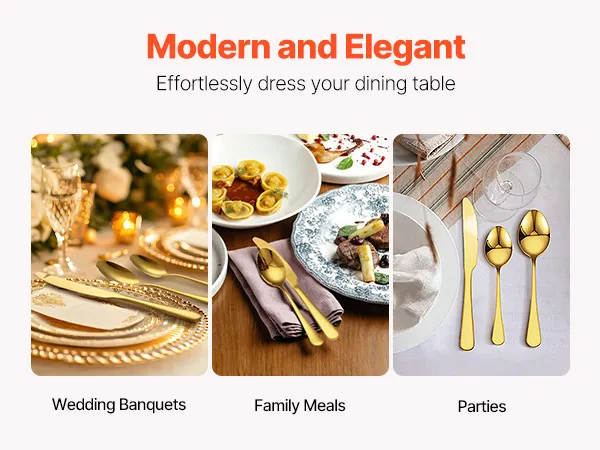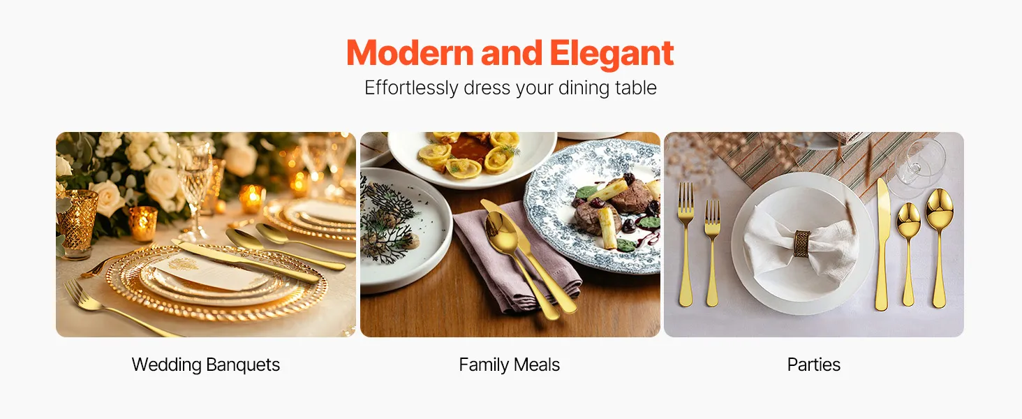 Questo squisito set di posate è una scelta pratica ed elegante per casa, hotel, cucine, feste, campeggio, picnic, ristoranti, matrimoni, ecc. Aggiunge un tocco di raffinatezza al tuo stile di vita, rendendolo il regalo perfetto per inaugurazioni di casa e occasioni speciali.