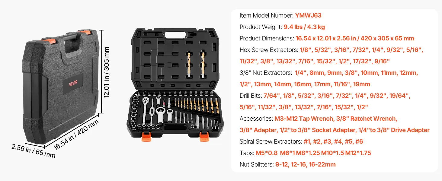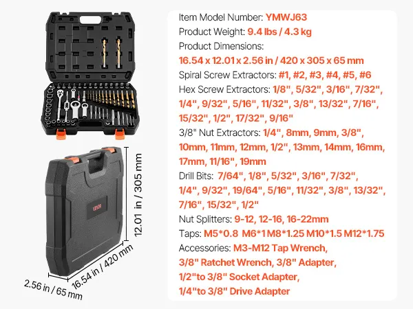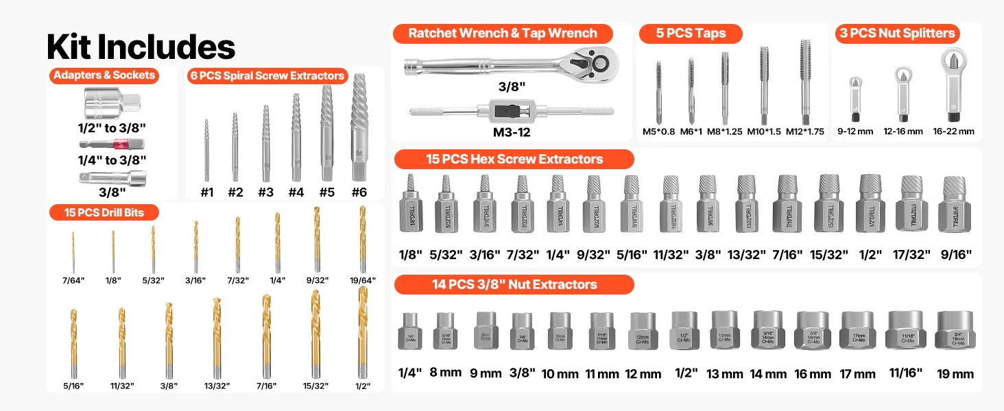 Kit di riparazione e filettatura da 63 pezzi: Questo kit di estrazione di viti rotte include 14 estrattori di dadi, 15 estrattori esagonali, 15 punte da trapano, 6 estrattori di viti elicoidali, 3 spaccadadi, 5 maschi, una chiave a cricchetto, una chiave per maschi e numerosi adattatori per riparazioni complesse