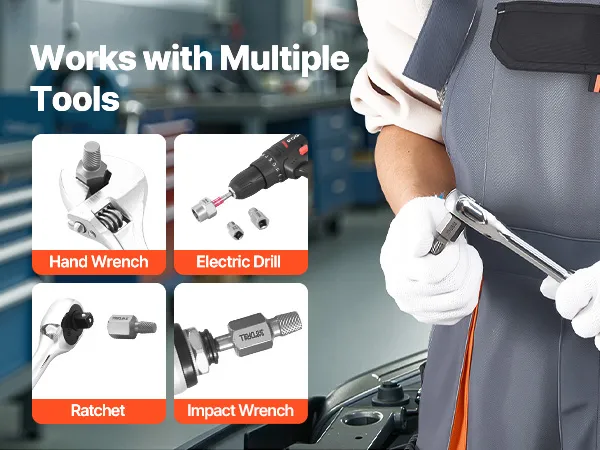 Il nostro kit di estrazione bulloni è progettato per integrarsi facilmente con i comuni utensili manuali ed elettrici, consentendoti di continuare a lavorare con la configurazione che preferisci.