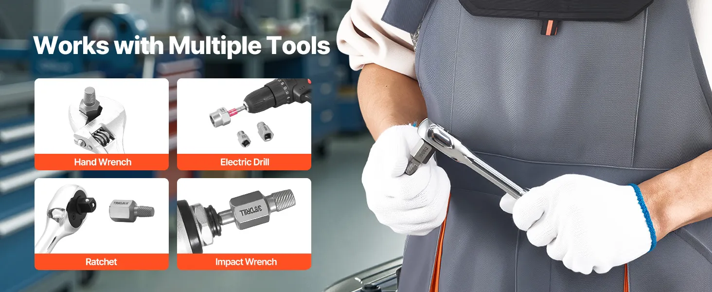 Compatibile con i tuoi utensili esistenti: Compatibile con i comuni utensili manuali ed elettrici, il nostro kit di estrazione viti rotte consente una transizione graduale tra le configurazioni senza modificare le tue abitudini di lavoro