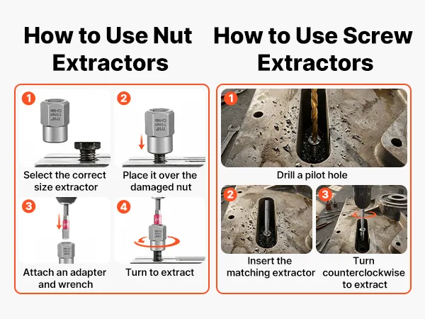 Un processo di estrazione chiaro per l'estrattore di bulloni danneggiato aiuta a ridurre gli errori e a migliorare le percentuali di successo, anche in caso di elementi di fissaggio gravemente danneggiati.