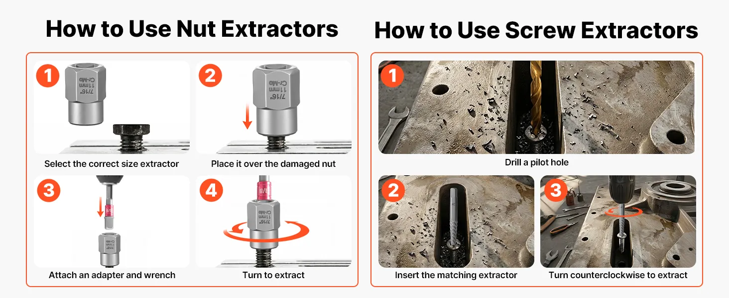 Estrazione di elementi di fissaggio bloccati e danneggiati: Questo kit di utensili per l'estrazione di viti è progettato per rimuovere viti, bulloni e dadi danneggiati, arrugginiti, arrotondati o rotti che gli strumenti convenzionali non riescono ad allentare