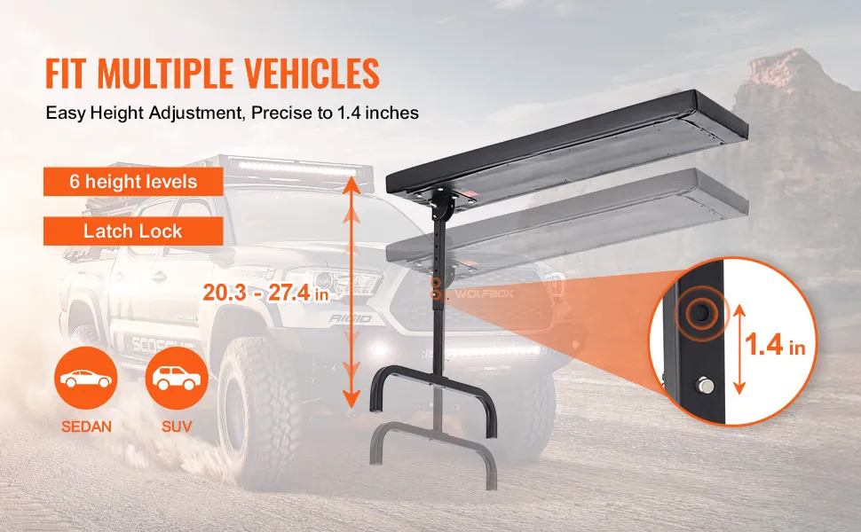 Dotato di fori nelle gambe per regolare l'altezza da 20,3 a 27,4 pollici (515-695 mm), questo carrello per auto si adatta a un'ampia gamma di veicoli.