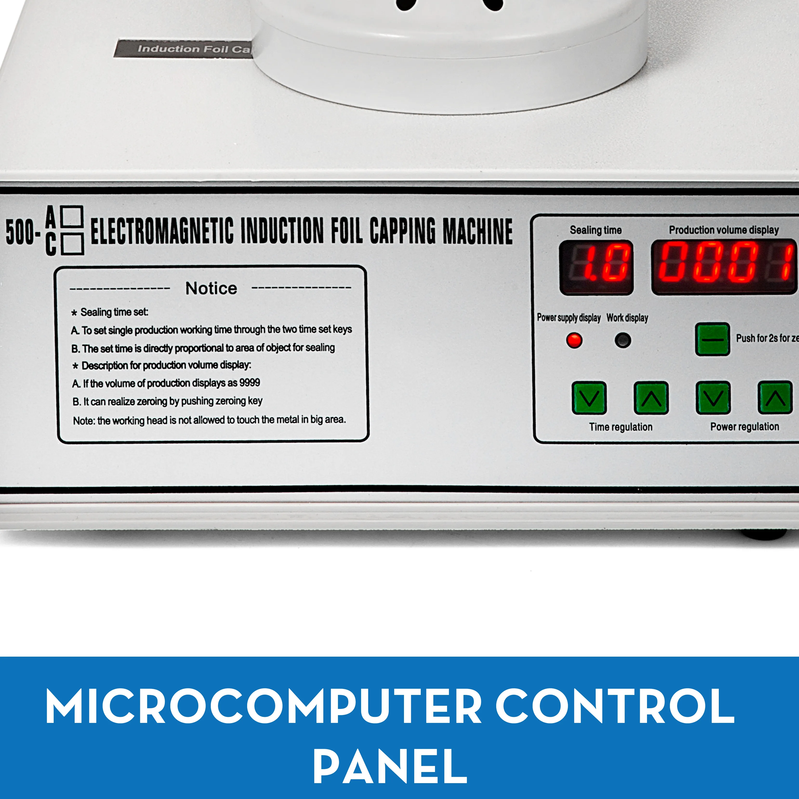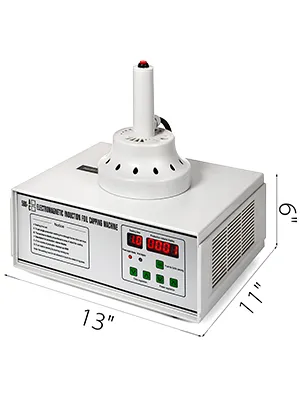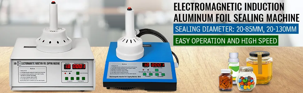 La sigillatrice a induzione consente di sigillare le bottiglie non metalliche con un foglio di alluminio sotto il dispositivo d'induzione elettromagnetica. Funziona applicando un calore elevato istantaneo sulla lamina che deve essere fusa per sigillare la bottiglia. Sigilla in pochi secondi e conserva e protegge tutto ciò che è immagazzinato all'interno. La sigillatrice a induzione può migliorare il periodo di conservazione del prodotto, migliorare le prestazioni a prova di falsi. È adatto per le piccole e discontinui lavoro di tenuta unità organizzative. La gamma di diametri di tenuta va da 20 MM a 130 MM. Potere di tenuta è di 500 W.