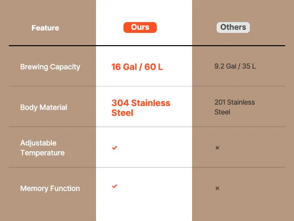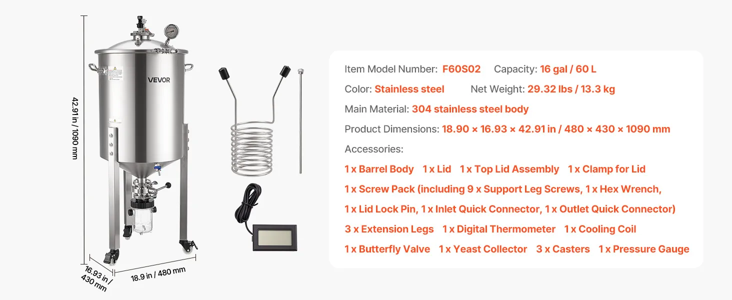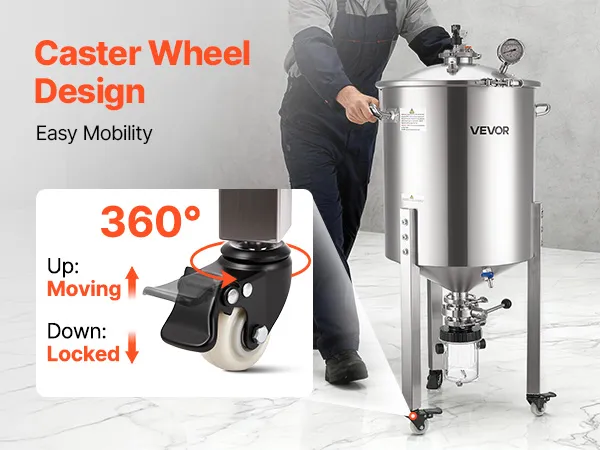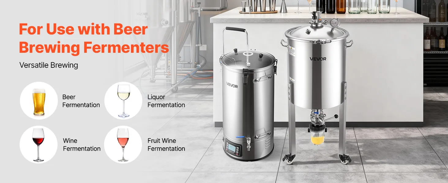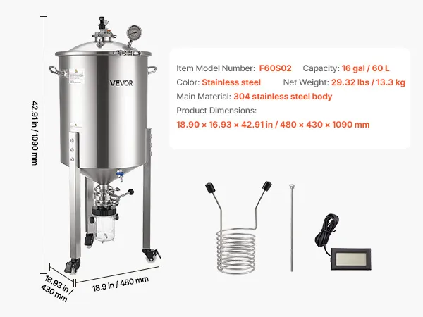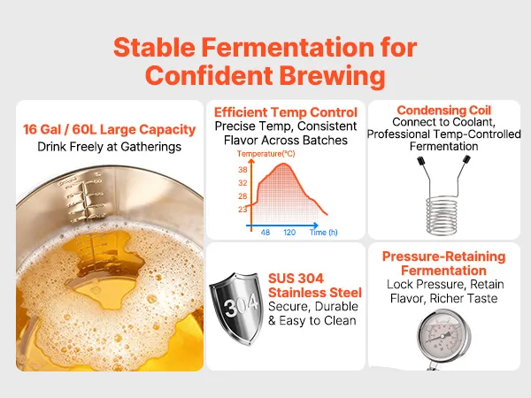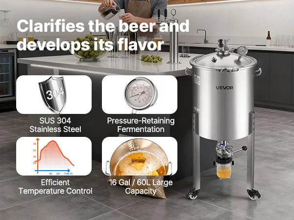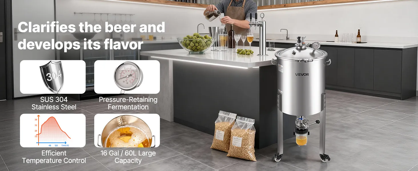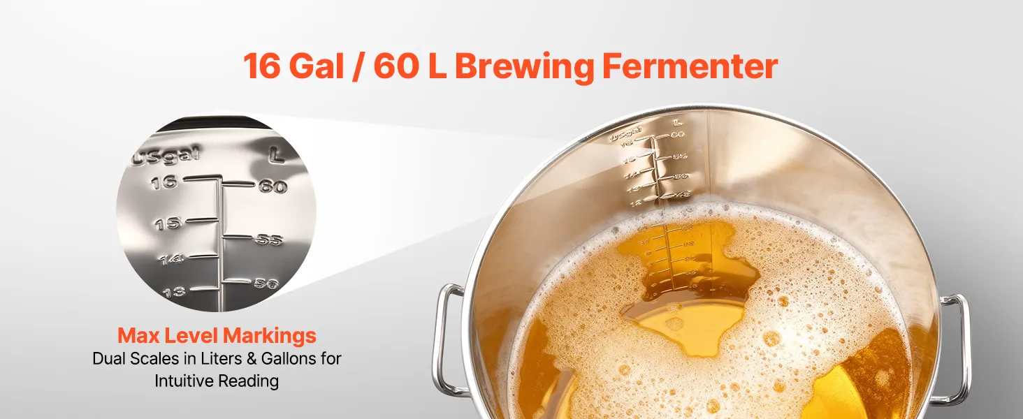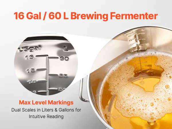 Ampia capacità: con una capacità di circa 16 gal (60 L), questo fermentatore per birra in acciaio supporta la fermentazione di birra, vino e vini di frutta. La doppia indicazione litro/gallone consente letture chiare