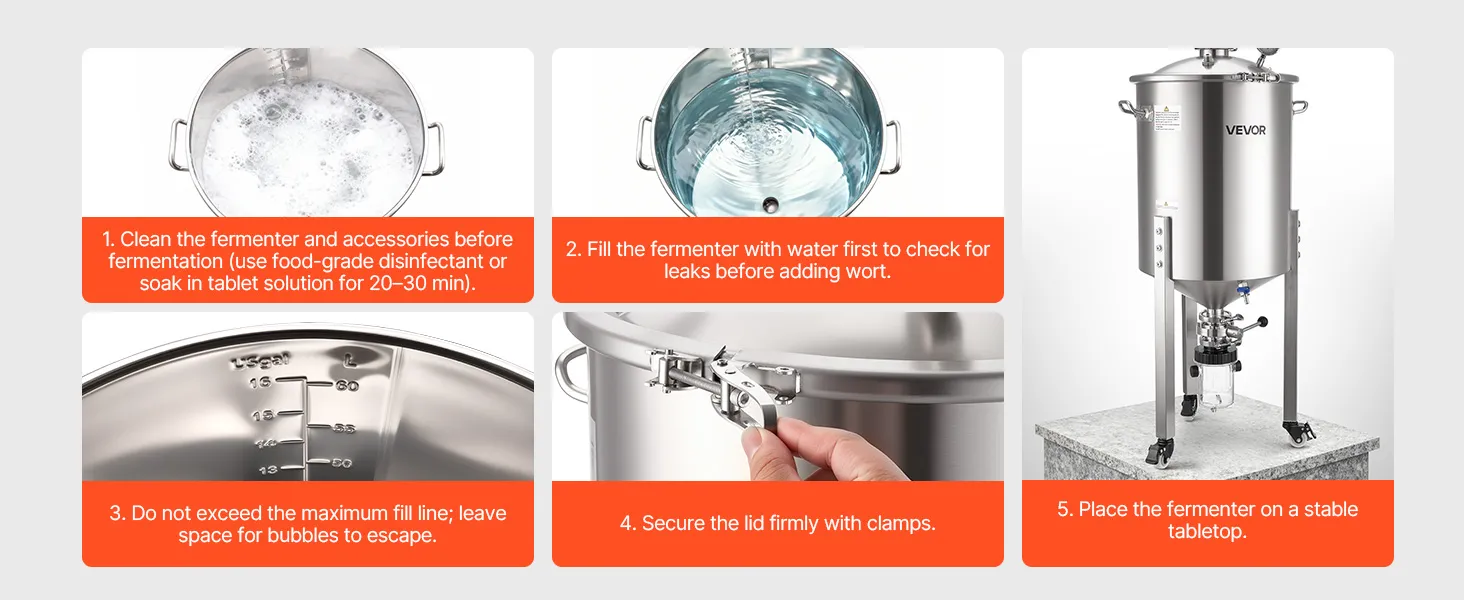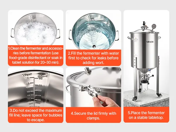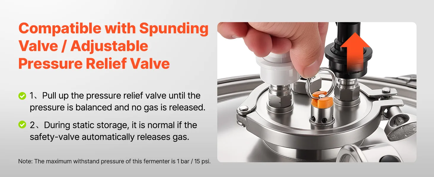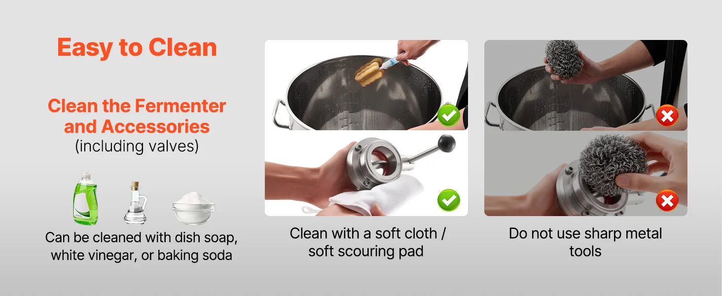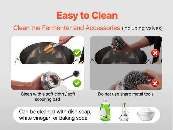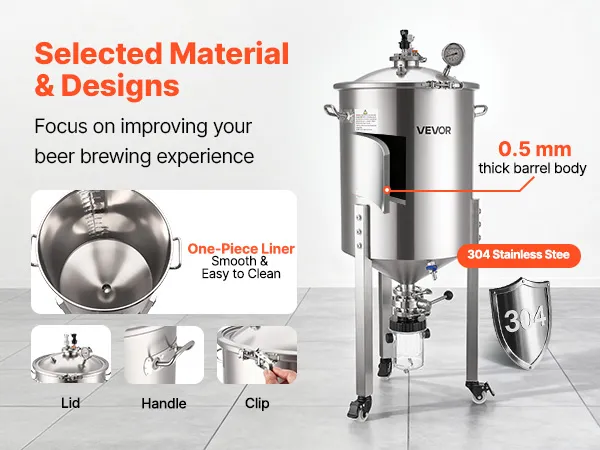 Acciaio inossidabile 304: il nostro recipiente di fermentazione è realizzato in acciaio inossidabile 304 per uso alimentare (spessore 0,5 mm) ed è durevole per un uso a lungo termine. La superficie liscia riduce l'accumulo di residui