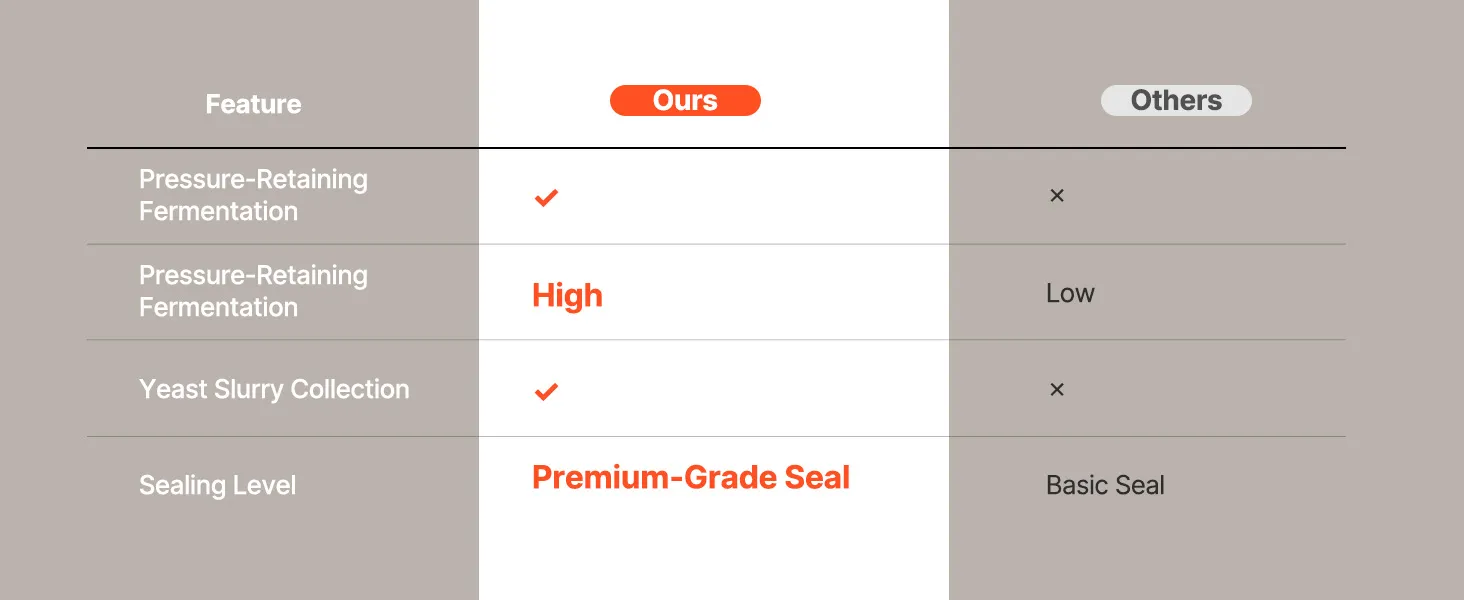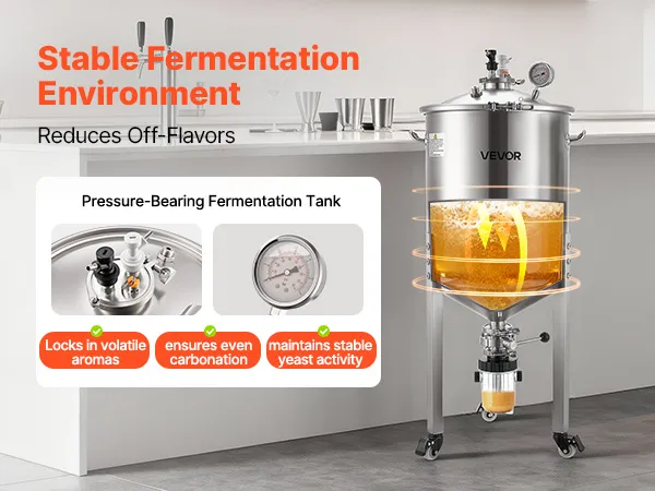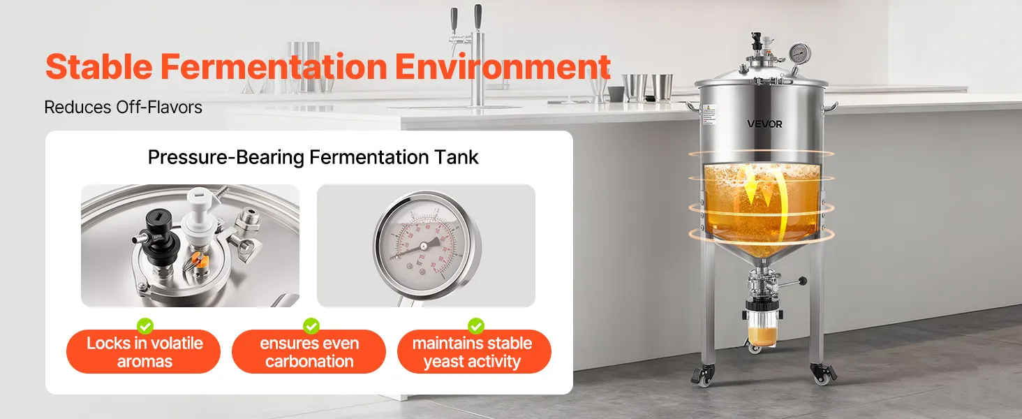 Questo serbatoio di fermentazione combina acciaio inossidabile 304 di alta qualità, un sistema di fermentazione a pressione costante, un controllo preciso della temperatura e della pressione e un design intuitivo, il tutto in un'unica unità.