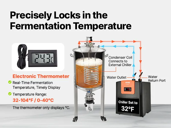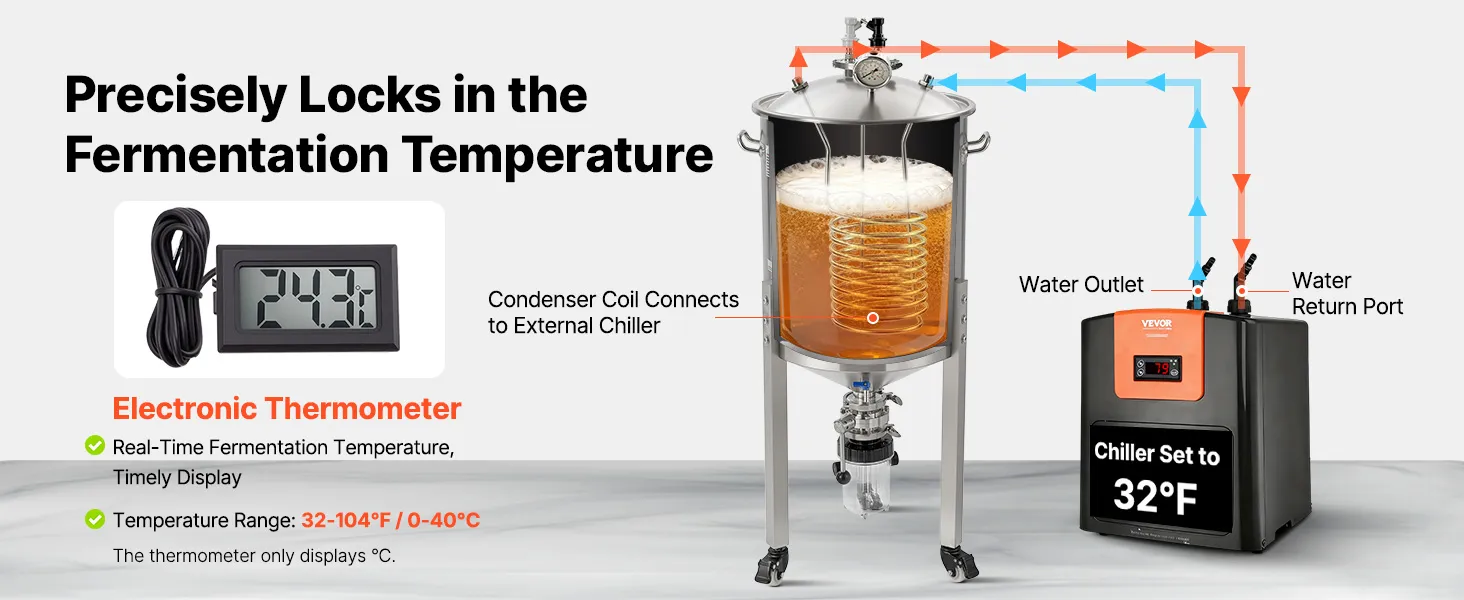 Controllo efficiente della temperatura: il fermentatore per birra è dotato di una serpentina di raffreddamento che può essere collegata a un refrigeratore per un controllo preciso della temperatura del mosto