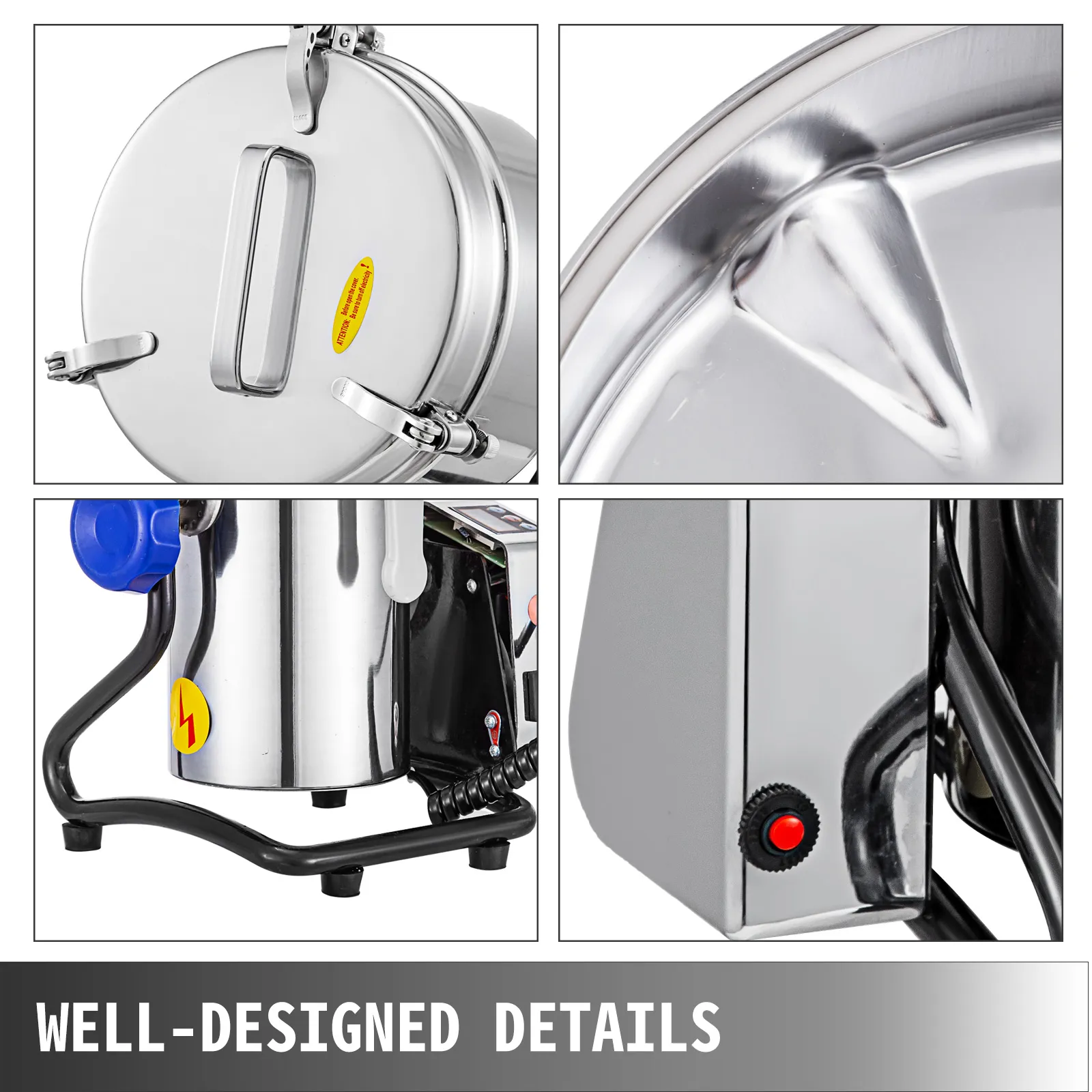 È costruito con materiale in acciaio inossidabile 304, resistente e robusto. Adotta la lama a tre strati con velocità di rotazione di 25000 giri / min, in grado di frantumare tutti i tipi di cibo disidratato velocemente e facilmente.