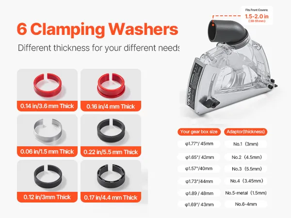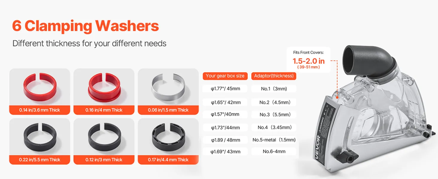 La nostra protezione antipolvere per smerigliatrice è compatibile con la maggior parte delle coperture frontali per smerigliatrici angolari da 1,5-2,01 pollici. Le 6 rondelle di serraggio hanno uno spessore compreso.