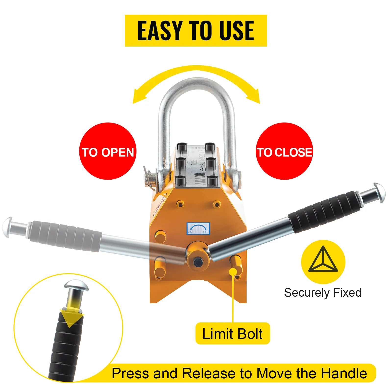 Facile Controllo della Maniglia: il design della maniglia in gomma semplifica il controllo del sollevatore magnetico senza bisogno di elettricità, che gira a sinistra per aprire l'aspirazione ea destra per chiudere l'aspirazione. Il bullone di sicurezza può fissare la maniglia.