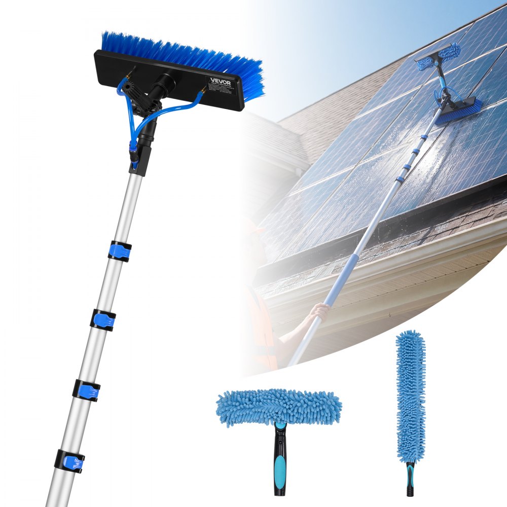 VEVOR Kit di Pulizia per Pannelli Fotovoltaici, 7,3m, Spazzola con Asta Telescopica in Alluminio per Lavaggio di Pannelli Solari su Tetti, con Attacco Acqua, Dispenser di Sapone, Testa Girevole a 180°