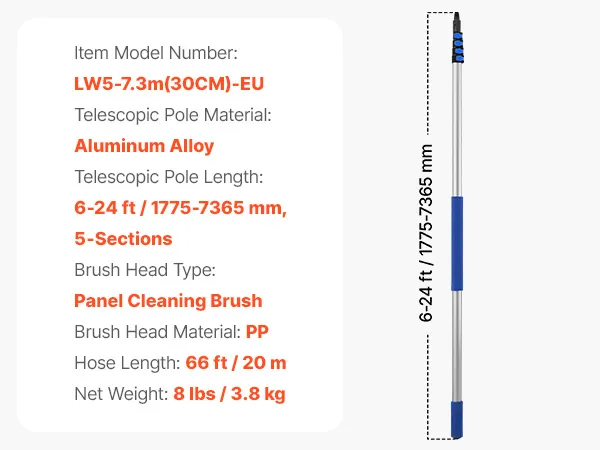 Questo kit con asta telescopica ad acqua è regolabile fino a 7,3 m (24 ft). La spazzola con testa girevole a 180° e doppia uscita d’acqua garantisce una pulizia completa. Include connettori rapidi e tubo da 20 m (65,6 ft) per un’installazione semplice e un uso versatile.