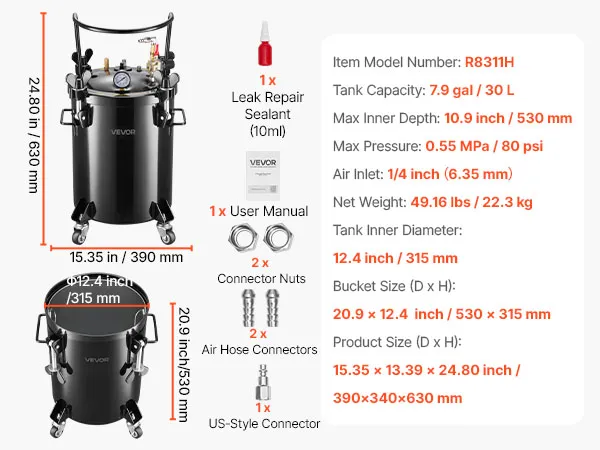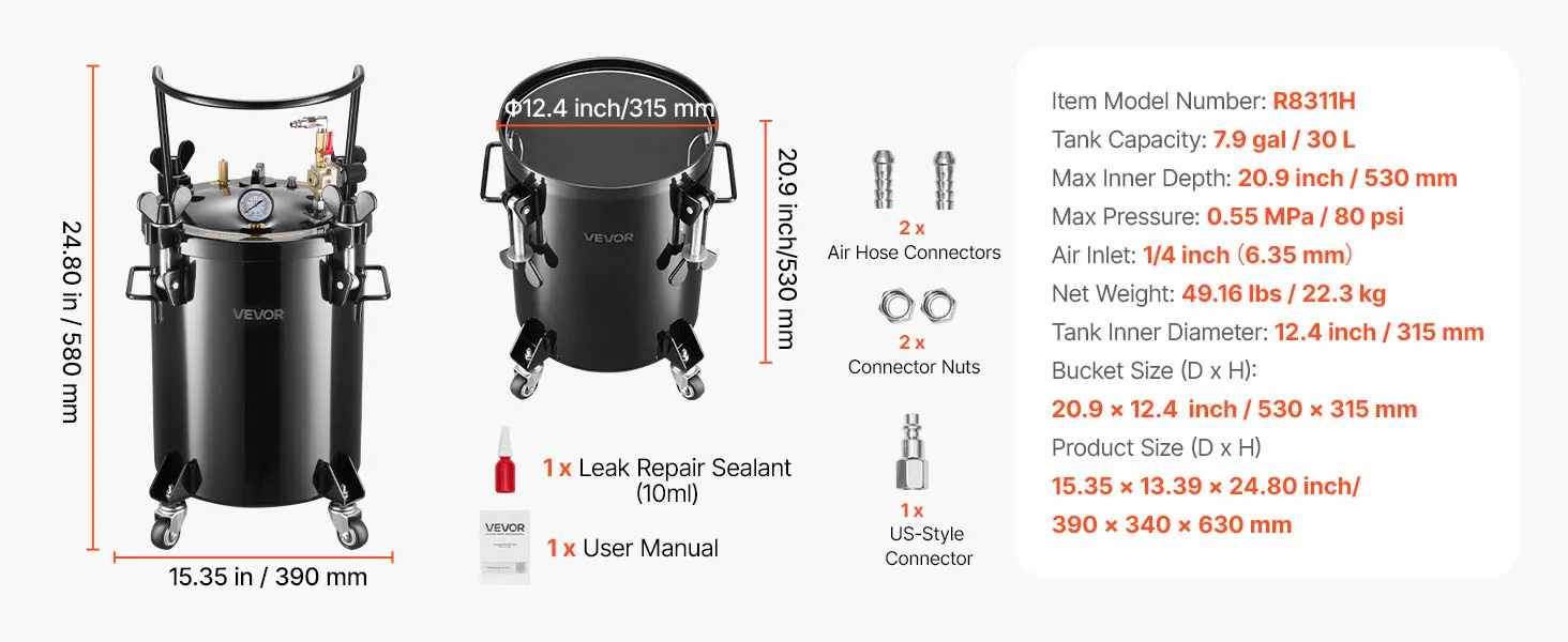 VEVOR Serbatoio a Pressione per Spray Serbatoio per Vernice a Pressione in Acciaio Resistente da 30 L Serbatoi per Vernice Spray con Tre Attacchi Rapidi per Uso Domestico, Creazioni Artistiche