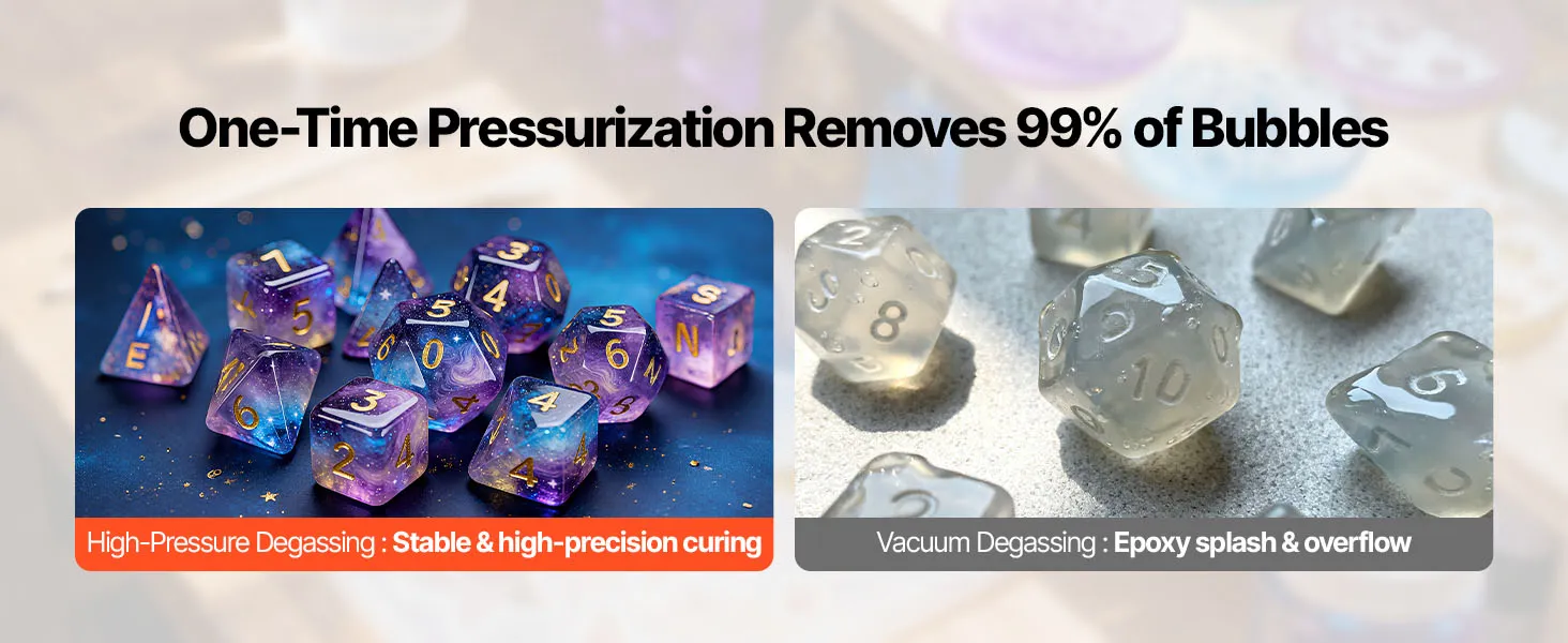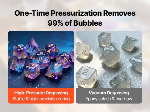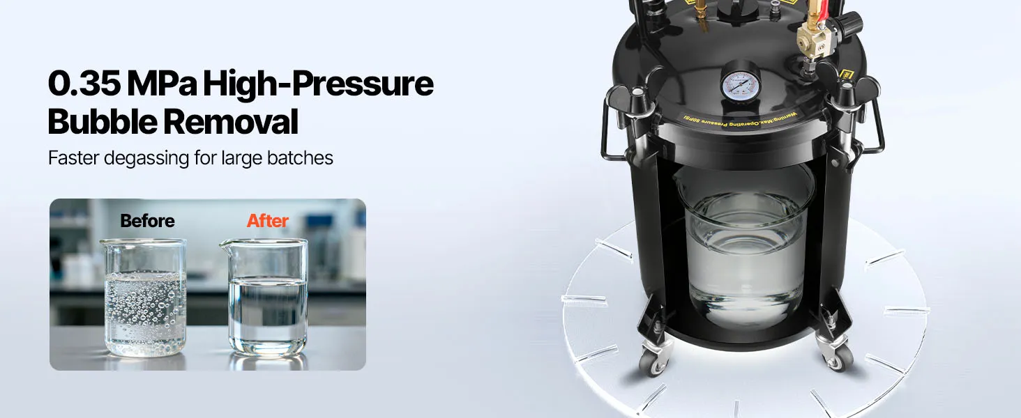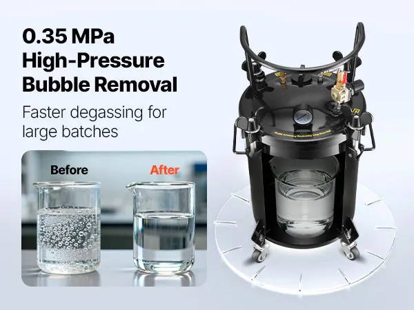 Finitura liscia e trasparente: progettato per progetti di colata, il nostro serbatoio a pressione raggiunge fino a 0,55 MPa/80 psi per rimuovere il 99% delle bolle interne, lasciando i pezzi fai da te privi di bolle, trasparenti e lisci