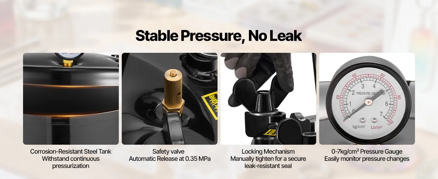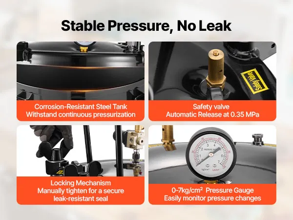 Chiusura sicura: con un corpo in acciaio rinforzato, questa pentola a pressione VEVOR supporta pressioni elevate. I dadi manuali fissano il serbatoio senza attrezzi, mantenendo una pressione stabile durante la polimerizzazione
