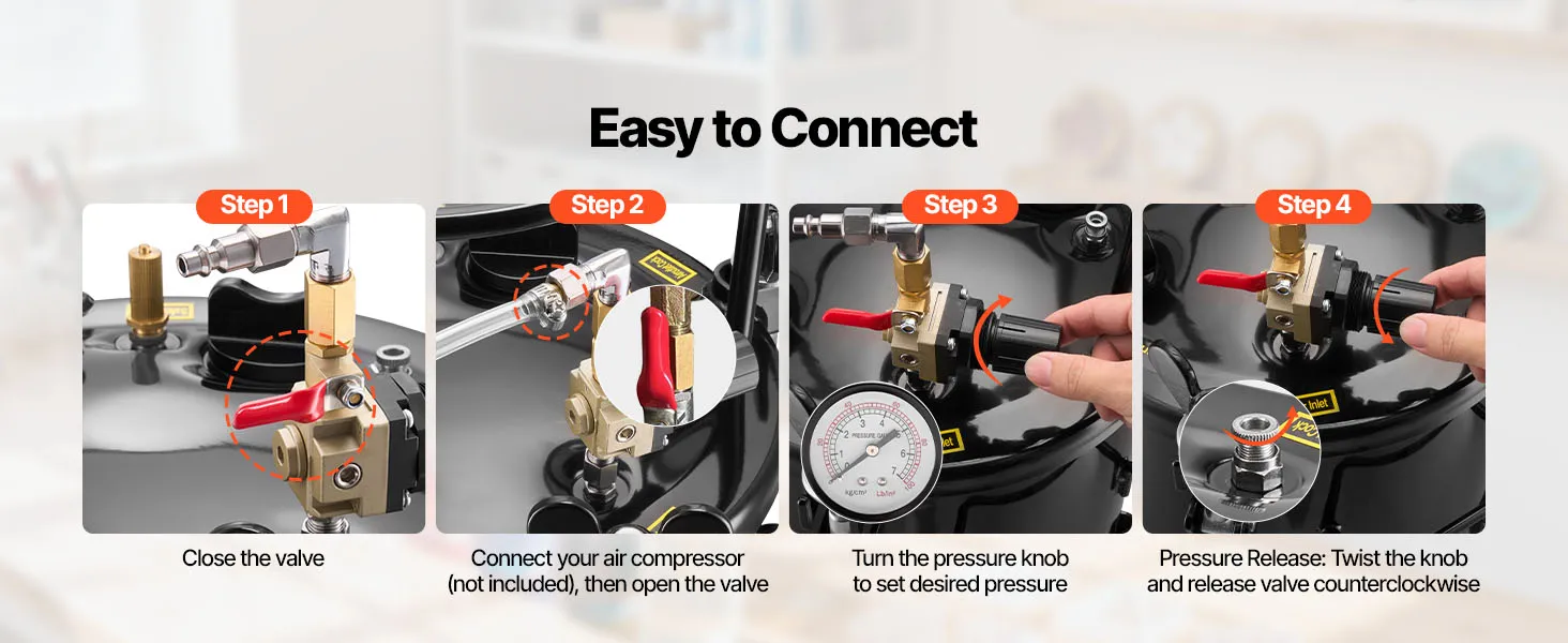 Collega rapidamente il tuo compressore utilizzando il raccordo rapido standard da 1/4″ (6,4 mm), rendendo il funzionamento fluido ed efficiente.